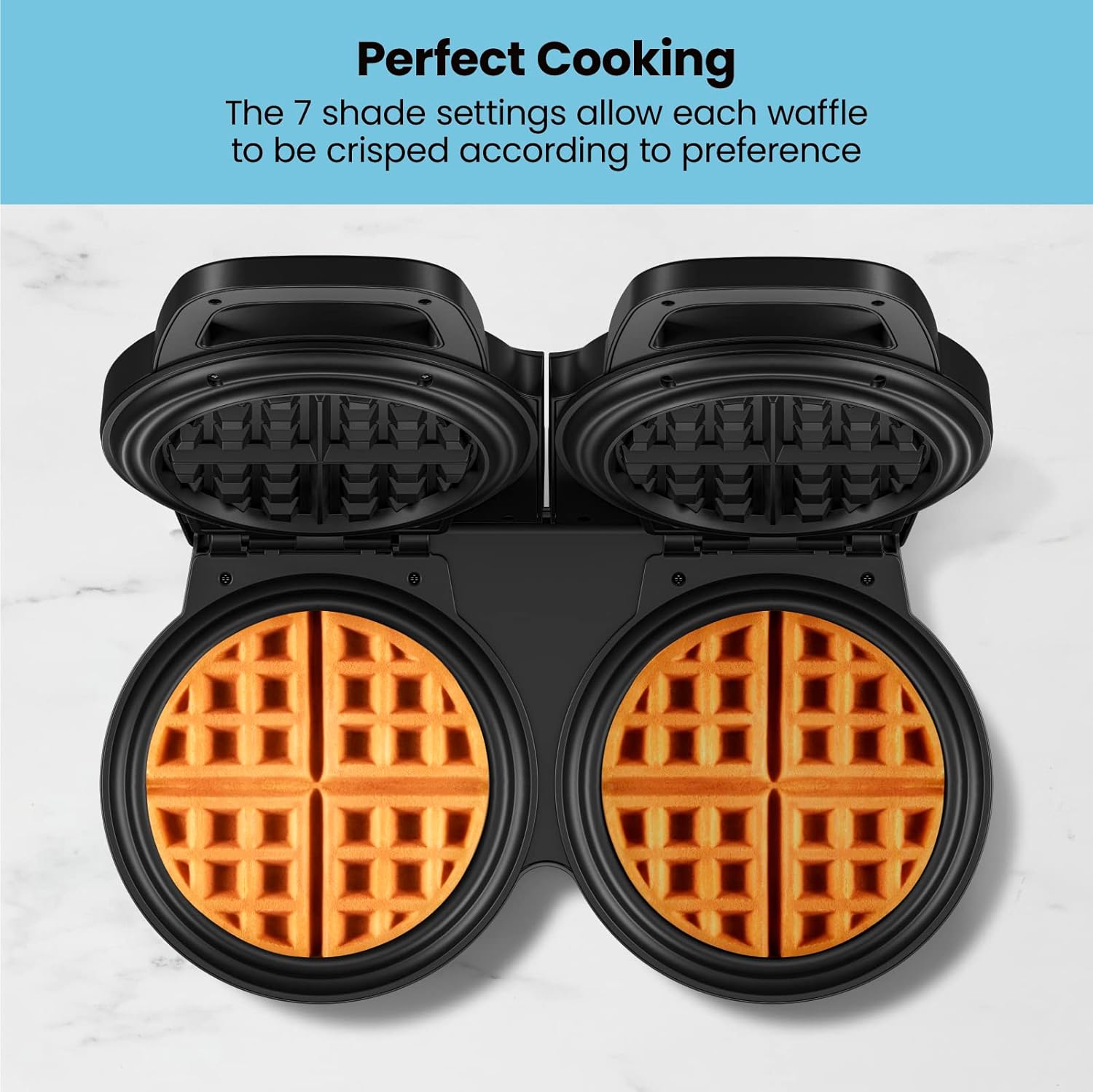 - 7 SHADE SETTINGS: Choose from 7 different shade settings to cook your waffles exactly how you like it. The higher the setting, the darker and crispier it will be. Spill-Proof Locking Latch