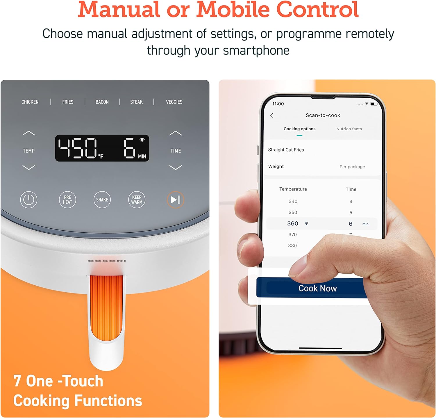 | Special Feature | 4 Cooking Functions, Temperature Control, Timer, In-App Recipes with Nutrition Facts, Automatic Shut-Off, Programmable, 97% Less Oil |
