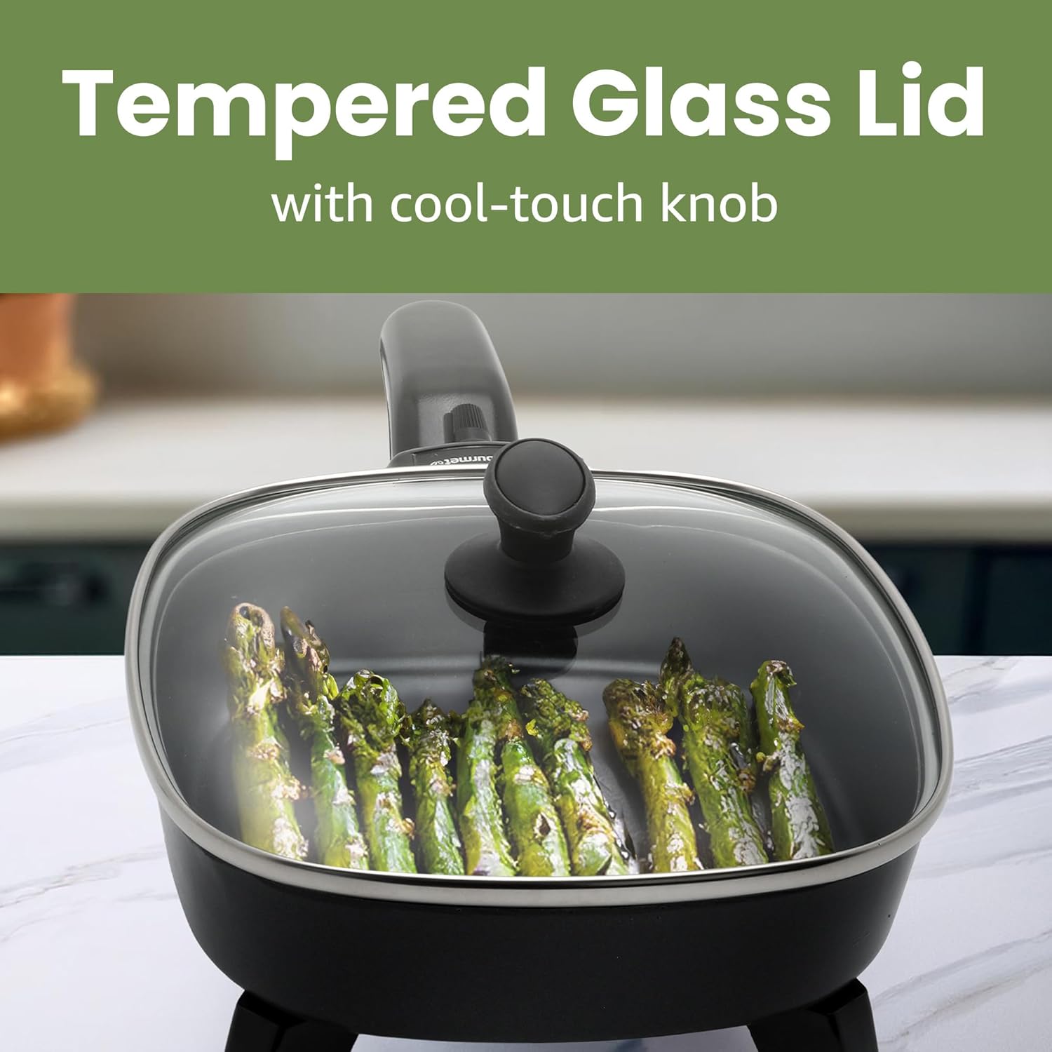 - GLASS LID: The tempered glass lid with cool-touch knob prevents cooking platters or assists in keeping food warm.