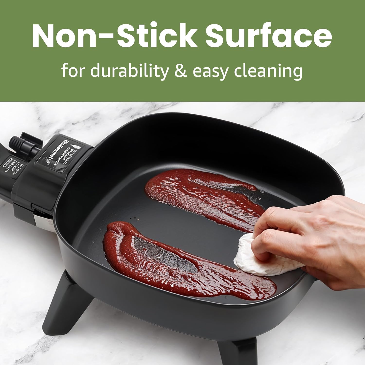 - REMOVABLE LOCKING HANDLE: The clip-on handle easily unlocks from the heating pan for easy cleaning and storage.