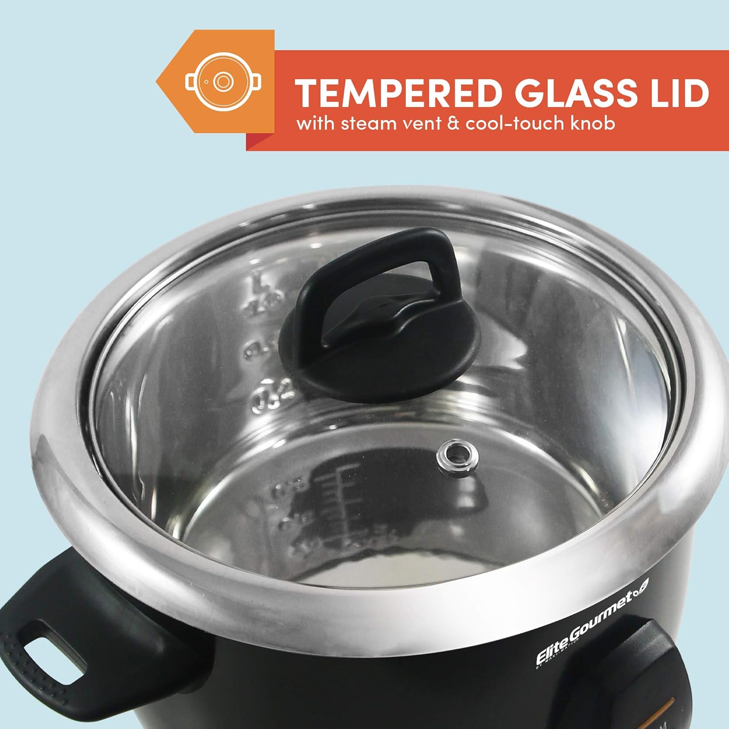 Tempered glass lid with steam vent for convenient viewing of cooking.
