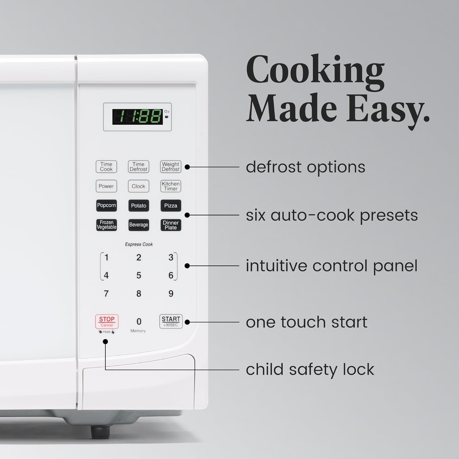 - ALL YOU NEED: This microwave has a clear LED display with a kitchen timer and clock that lets you easily keep track of time. Easy-to-view interior lighting lets you keep an eye on your dish, and a child safety lock adds additional security.