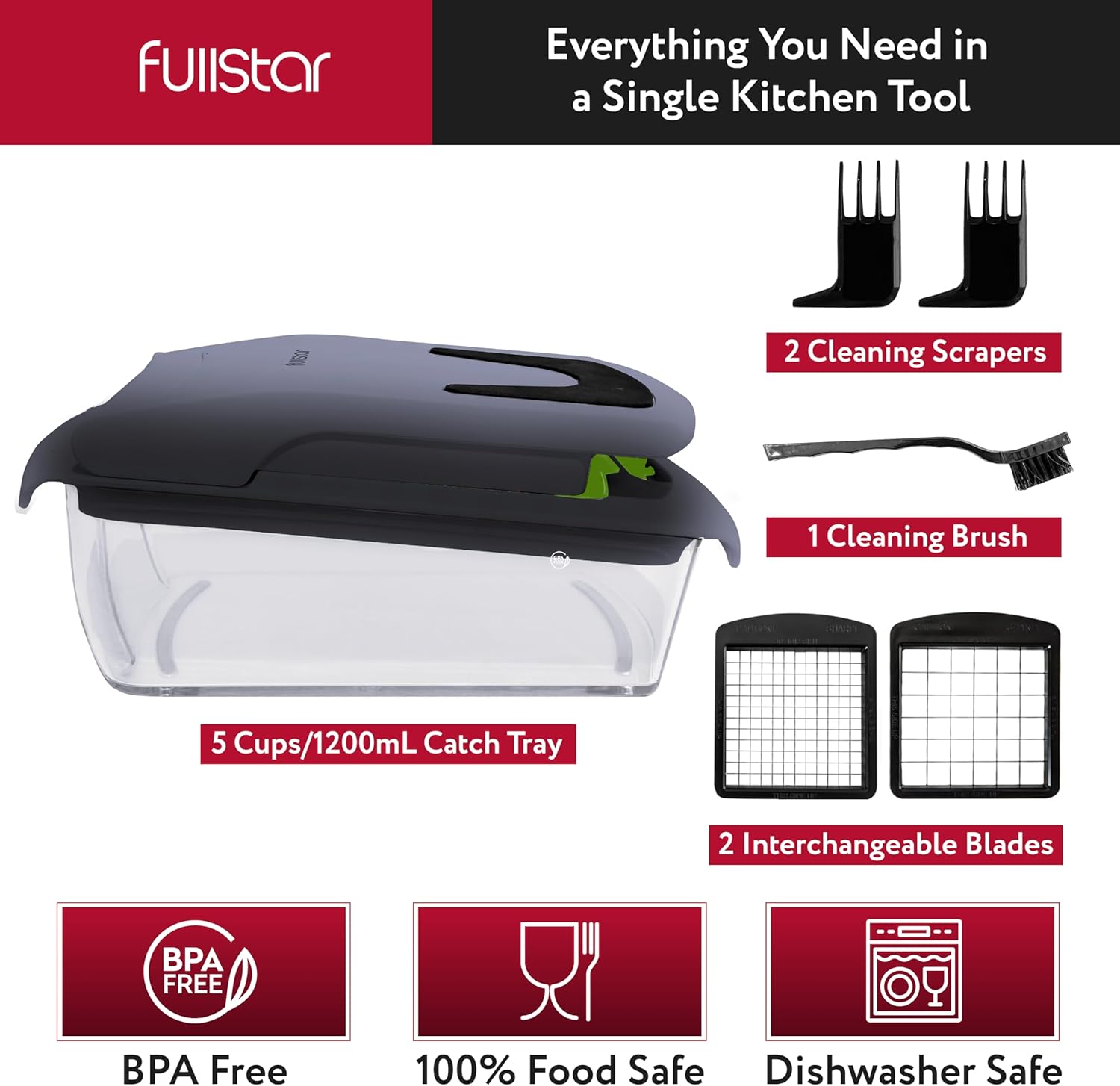 - No mess and slips - our catch tray makes cooking so much more convenient, no mess and no messing around! It makes cleaning effortless and our non-slip base also makes your chopping that much easier. Plus the entire chopper is dishwasher-safe (top rack) .