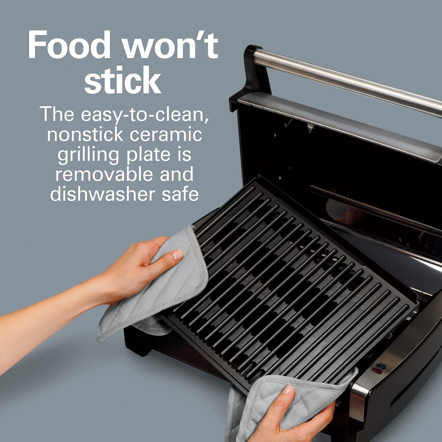 - EASY-TO-CLEAN NONSTICK GRILLING PLATE. The nonstick grilling plate keeps food from sticking to this indoor electric grill as you cook and is removable and dishwasher safe, so there's no more endless scraping to remove stuck-on food.