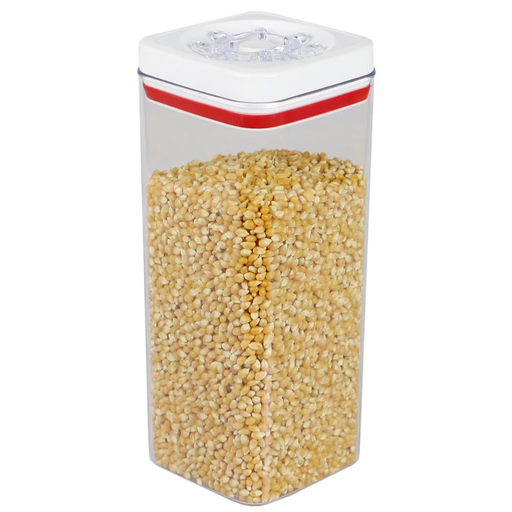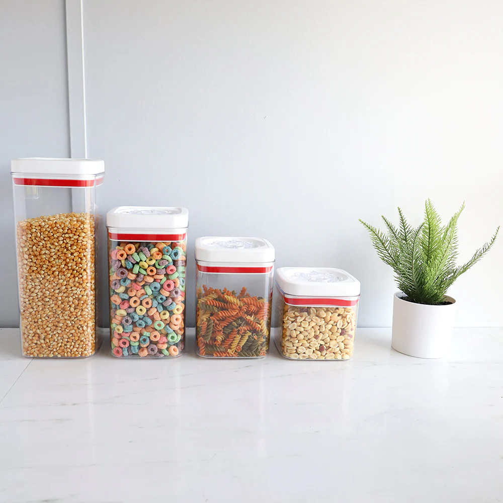 All it takes is a simple turn of the wheel to lock and seal. Your favorite dried food staples will stay fresh for days with this twist and lock canister set. Constructed from thick, shatter-resistant plastic walls. With clear sides all around, you’ll get a quick peek of what you stowed away without having to untwist the top. Great for storing cereal, pasta, and nuts. Its square shape makes it easy to place side-by-side against on top of your counter or neatly in a kitchen pantry. If you want to keep your stock of pantry staples in sight and fresher for longer, this stylish storage container is perfect for you. Hand wash recommended but the containers are dishwasher safe. MATERIAL: Plastic. CAPACITY: 1 liter, 1.7 liter, 2.3 liters, and 3.1 liters. COLOR: Clear, White and Red