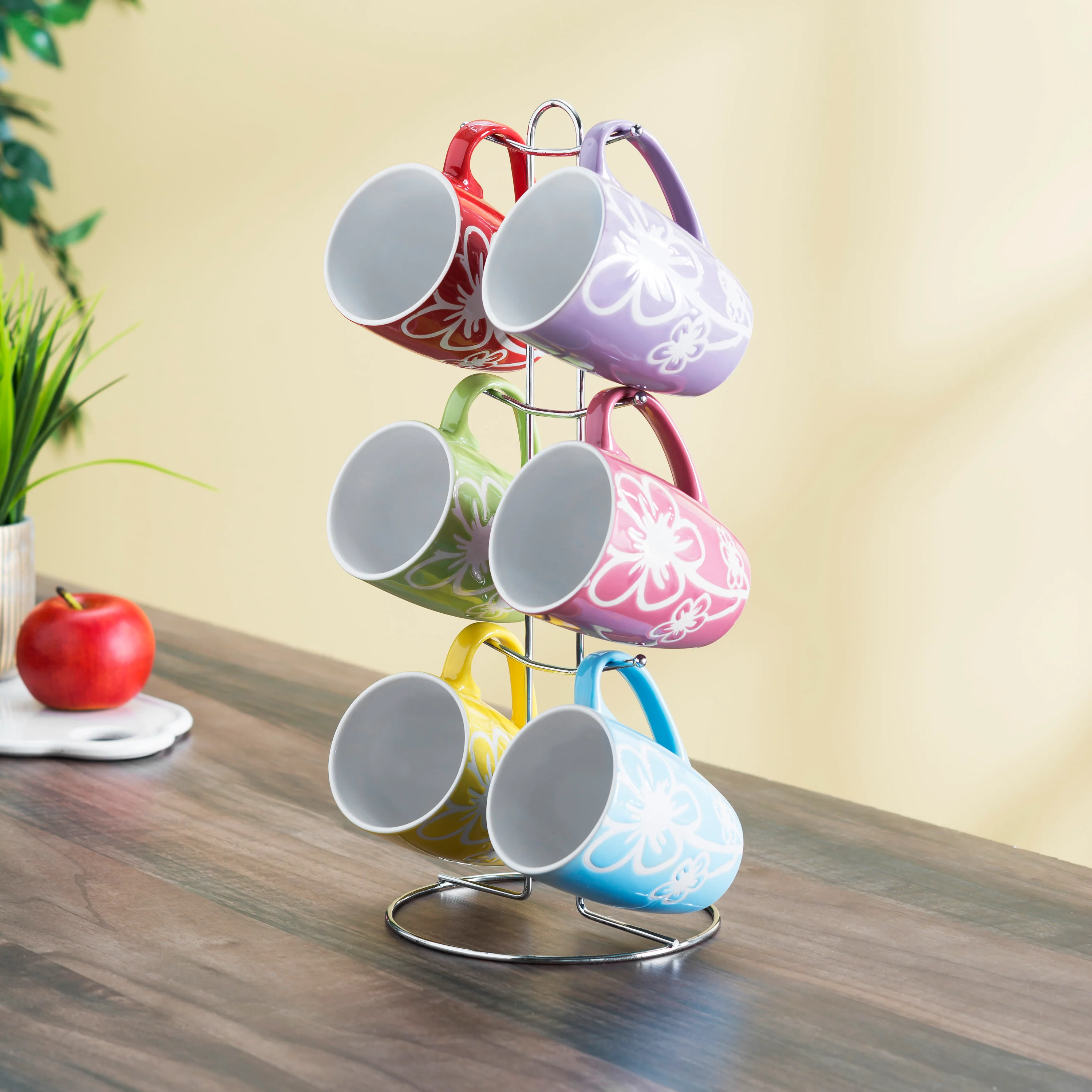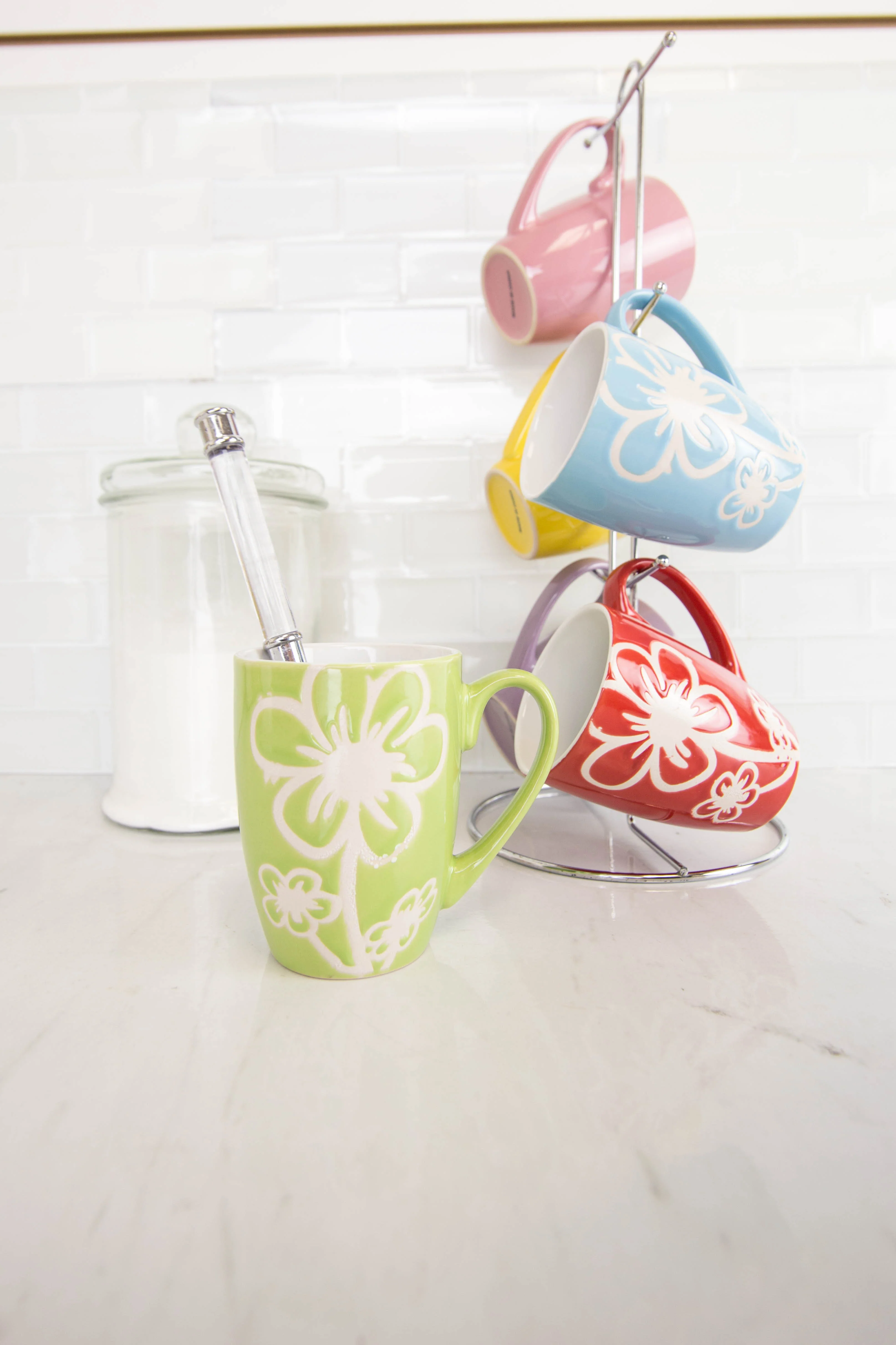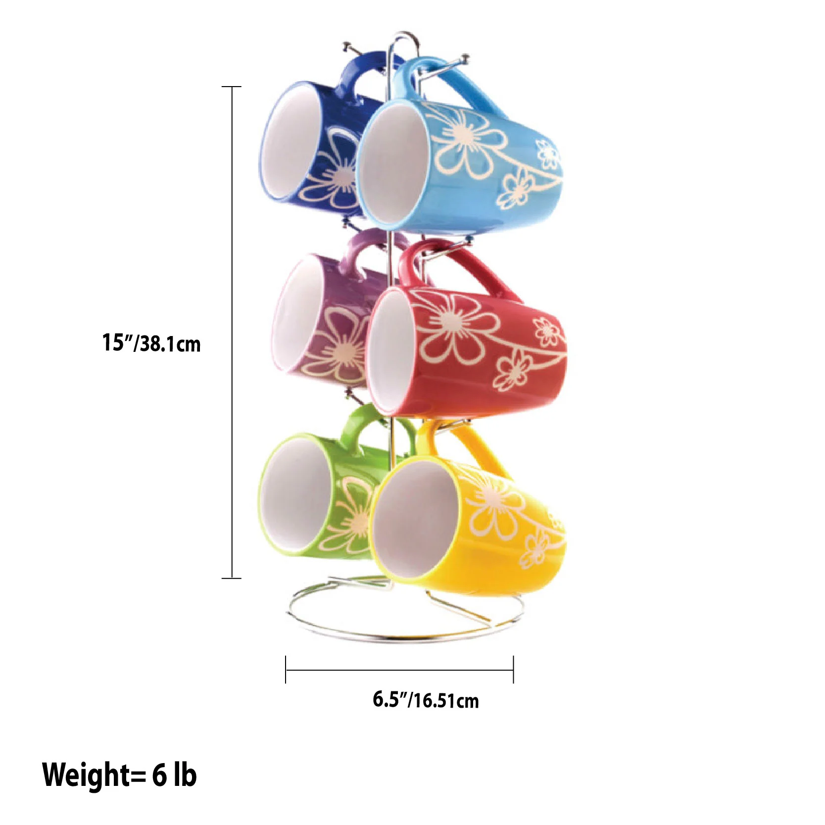 Engraved with elegant white daisies atop a soft, rich pastel hue, this adorable ceramic mug set is sure to brighten up any kitchen with its playful design. It comes complete with sleek chrome plated steel stand with angled branches to provide an all-around view of each glaze finished mug. Rounded ends ensure cups remain in place for all to admire. From a piping-hot cup of cocoa to ice-cold lemonade, these floral mugs make each sip of your favorite beverages extra exhilarting. CONTAINS: (1) Stand and (6) 11 Ounces Mug. COLOR: Multi