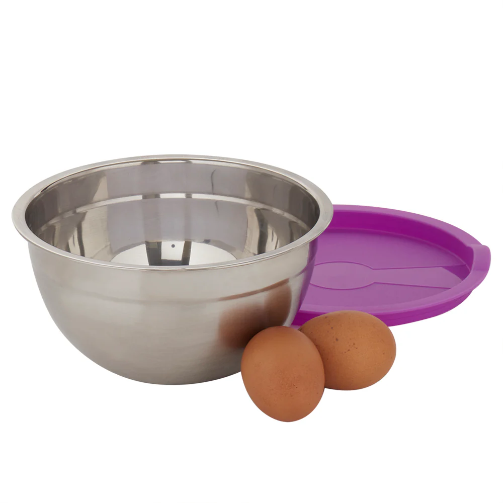 Minimize the mess when mixing with the help of these mixing bowls. Each mixing bowl comes with a lid so you can easily store it away in a fridge when not in use. Use to stir thick batters, whisk together eggs, or stir up light sauces. The set includes a small, medium, and large bowl for every kitchen need. The capacities for the bowls are 48 ounces, 83.3 ounces, and 134.4 ounces. Each of the bowls nest within each other to conserve space in a cupboard. Hand wash the unit with warm water and use gentle soap. Dry thoroughly. Item dimensions may differ slightly due to the unique nature of the product. Color and finish may also differ from the images shown due to differences in monitor displays. Props and accessories are not included. MATERIAL: Steel. SIZE: 10.25x4.75 Inches, 8.75x4 Inches and 7x3.5 Inches. CAPACITY: 134.4 ounce (4 liter), 83.2 ounce (2.46 liter) and 48 ounce (1.4 liter). COLOR: Blue, Purple and Yellow