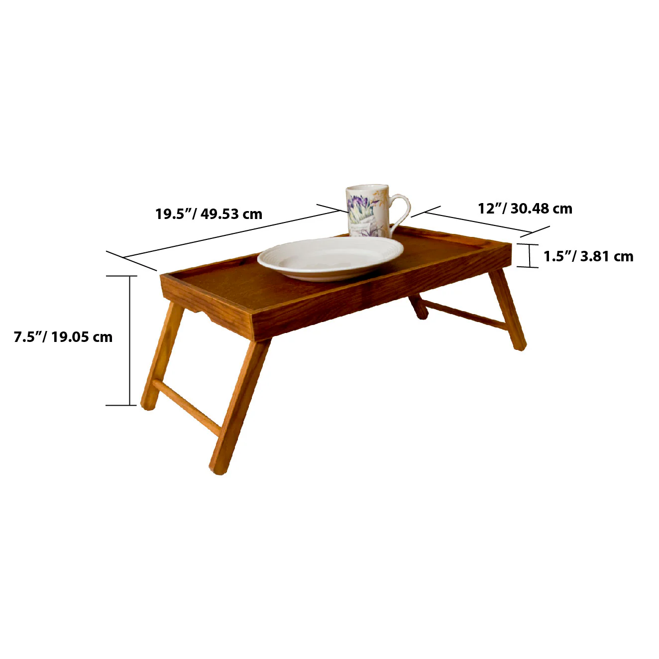 Equal parts mobile workstation and portable table, this all purpose bed tray allows you to snuggle up in the comfort of your own bed and enjoy a nice home cooked meal or curl up by the sofa and work on your laptop. The ample surface provides plenty of room to accommodate a medium plate, a tall glass, utensils, napkins with room to spare to rest your book and eye glasses. Great for working from home, the top can accommodates a medium sized laptop, keys, phone and a small stack of paper work. Fold the legs out to keep it elevated or fold legs inward to keep it flat to store away when not in use. MATERIAL: Pine Wood. SIZE: 8.3x11.8x19.5 Inches. COLOR: Natural