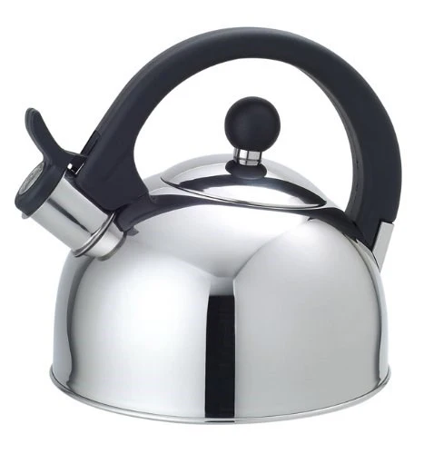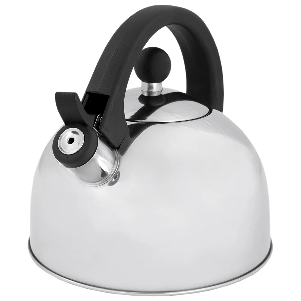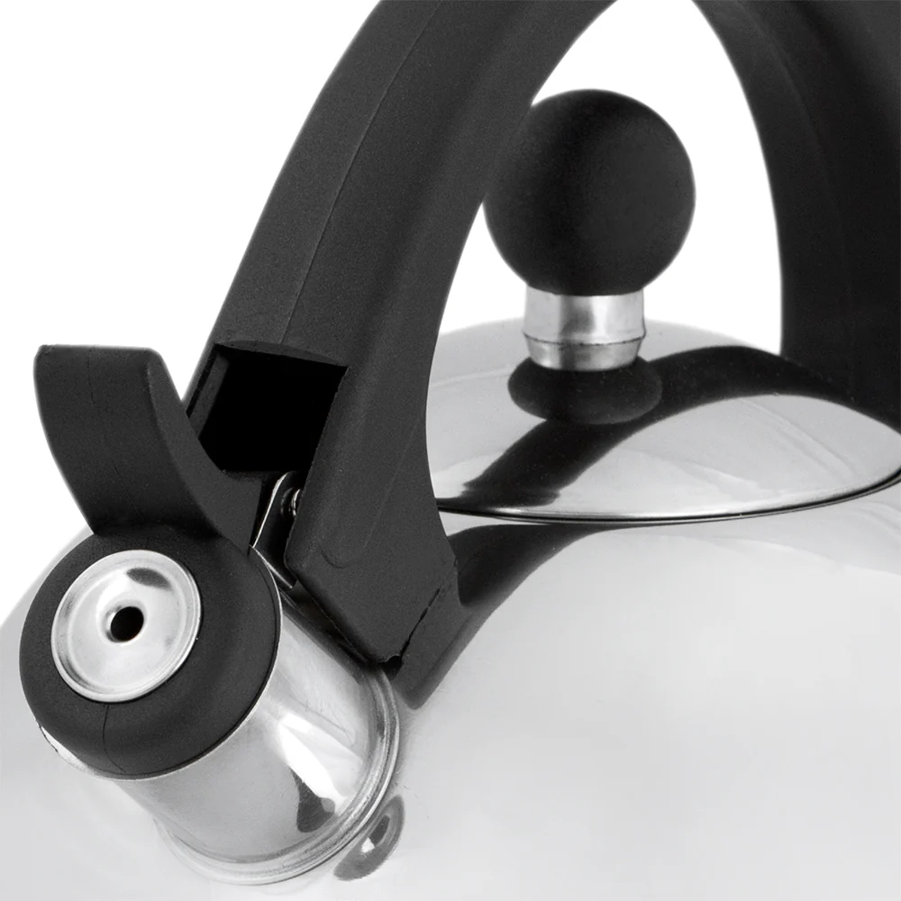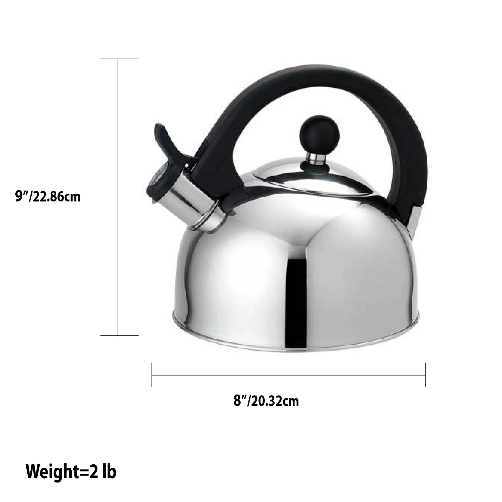 With a sound of whistle , enjoy brewing up your favorite tea, coffee in this 2.5 liter tea kettle! Wide, overarching handles provide a sturdy grip, while the plastic push-tab operated spout with small opening makes dispensing hot liquid a snap. The polished stainless steel design with matte black trim gleams with modern sophistication, while also quickly providing even heat distribution to create perfect boiling water for rich hot cocoa or sweet chamomile tea whenever you need it. MATERIAL: Stainless Steel. SIZE: 10.5 Cups (2.5 Liter). COLOR: Silver