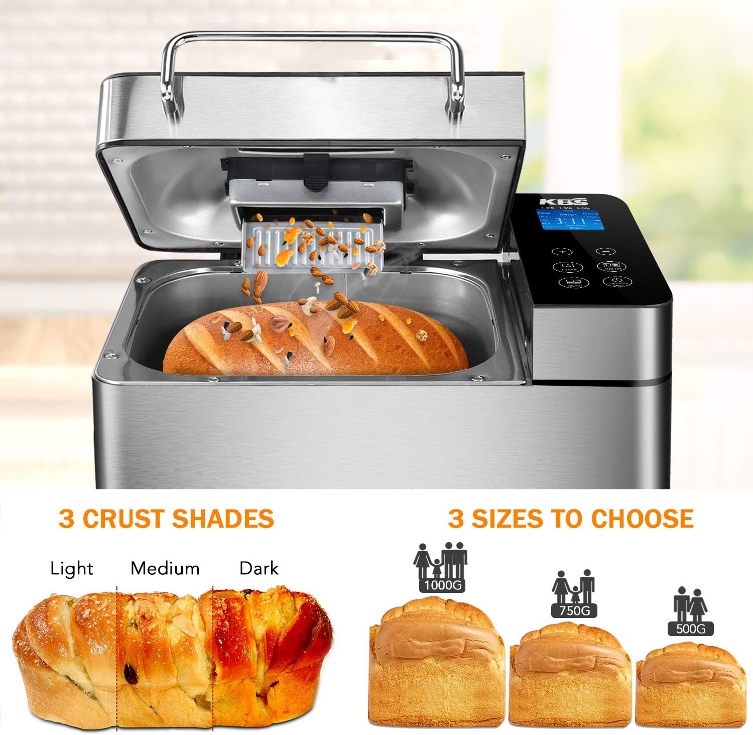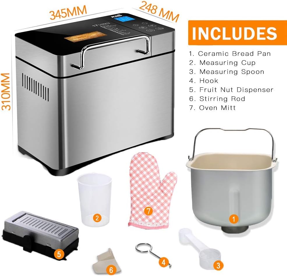 - MULTIPLE CUSTOMIZED NUTRITIOUS PROGRAMS AND 2LB LARGE ACTUAL CAPACITY: The KBS automatic bread machine has 17 practical programs for french, whole wheat, kneading and fermentation, jam, yogurt, cake, etc, not only a bread maker. Additional convenience with pizza dough setting and gluten free program. The "quick bake" bake a loaf in under 1.5 H. It bakes 1 lb, 1.5 lb, 2 lb loaves, and 3 crust settings in light, medium, dark. Bring a variety of options to your healthier and tastier homemade bread