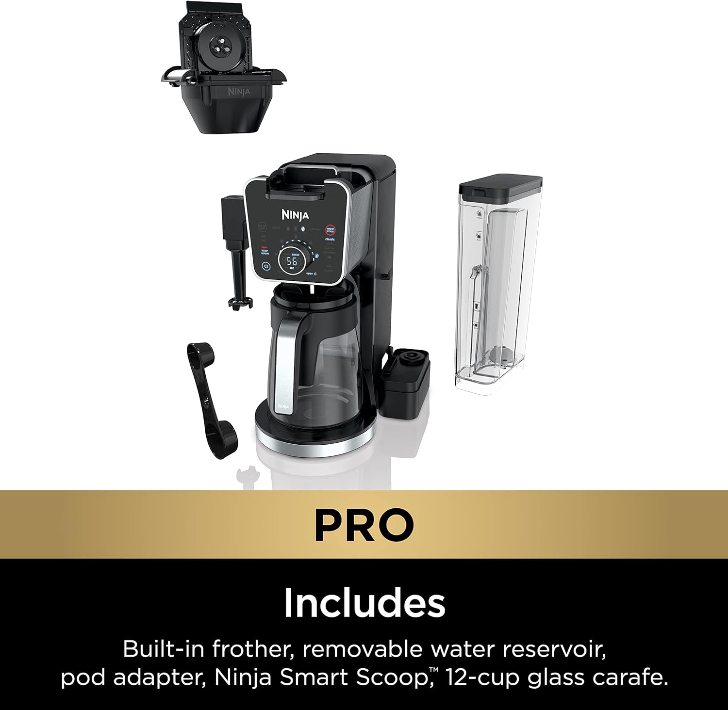 - WHAT'S INCLUDED: Components include Ninja smart scoop, Fold-away frother, Ninja DualBrew Pro Specialty Coffee Maker, K-Cup pod adapter, 12-cup glass carafe.