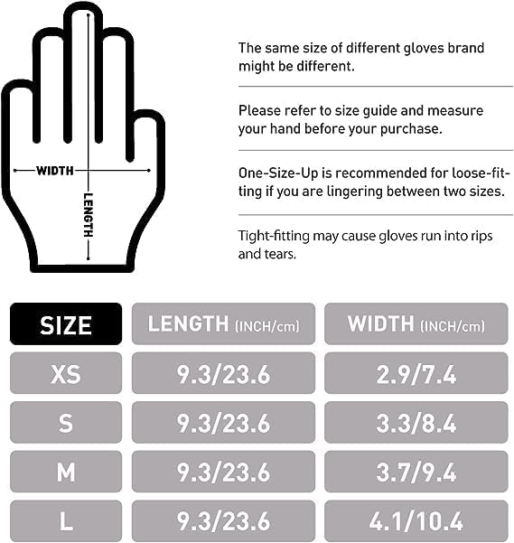 To ensure your gloves have the best fit, we've created a handy size chart below. Please keep in mind that gloves are like shoes: there are general sizes, but various styles will fit differently. Glove materials, thickness, elasticity, and texture are a few factors that can make one style of glove fit snugger or looser than another.