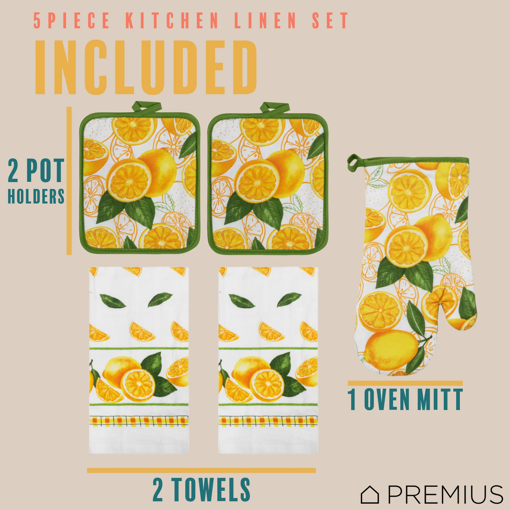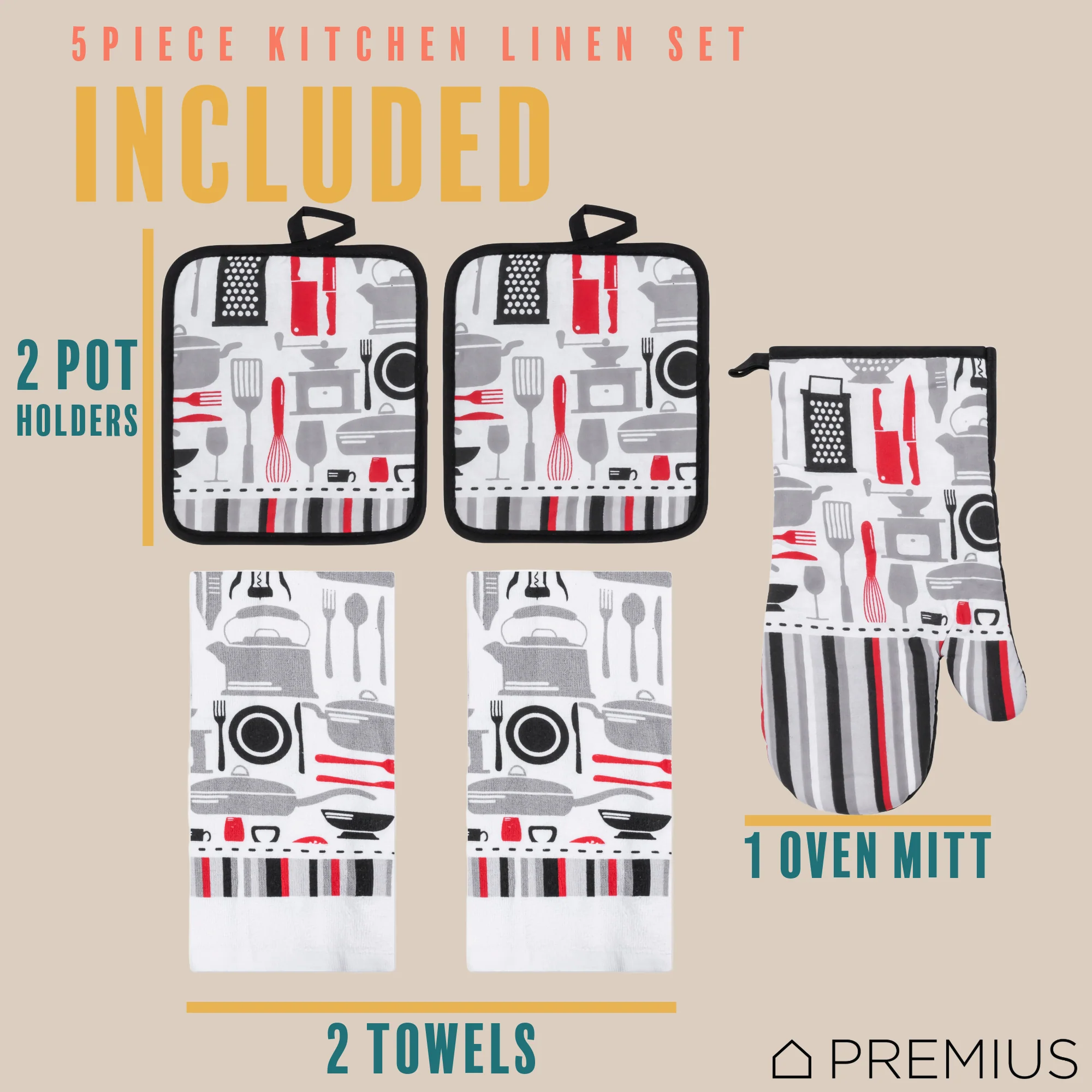 Upgrade your kitchen with this essential PREMIUS 5-piece set and say goodbye to mismatched dish towels, oven mitts and pot holders!