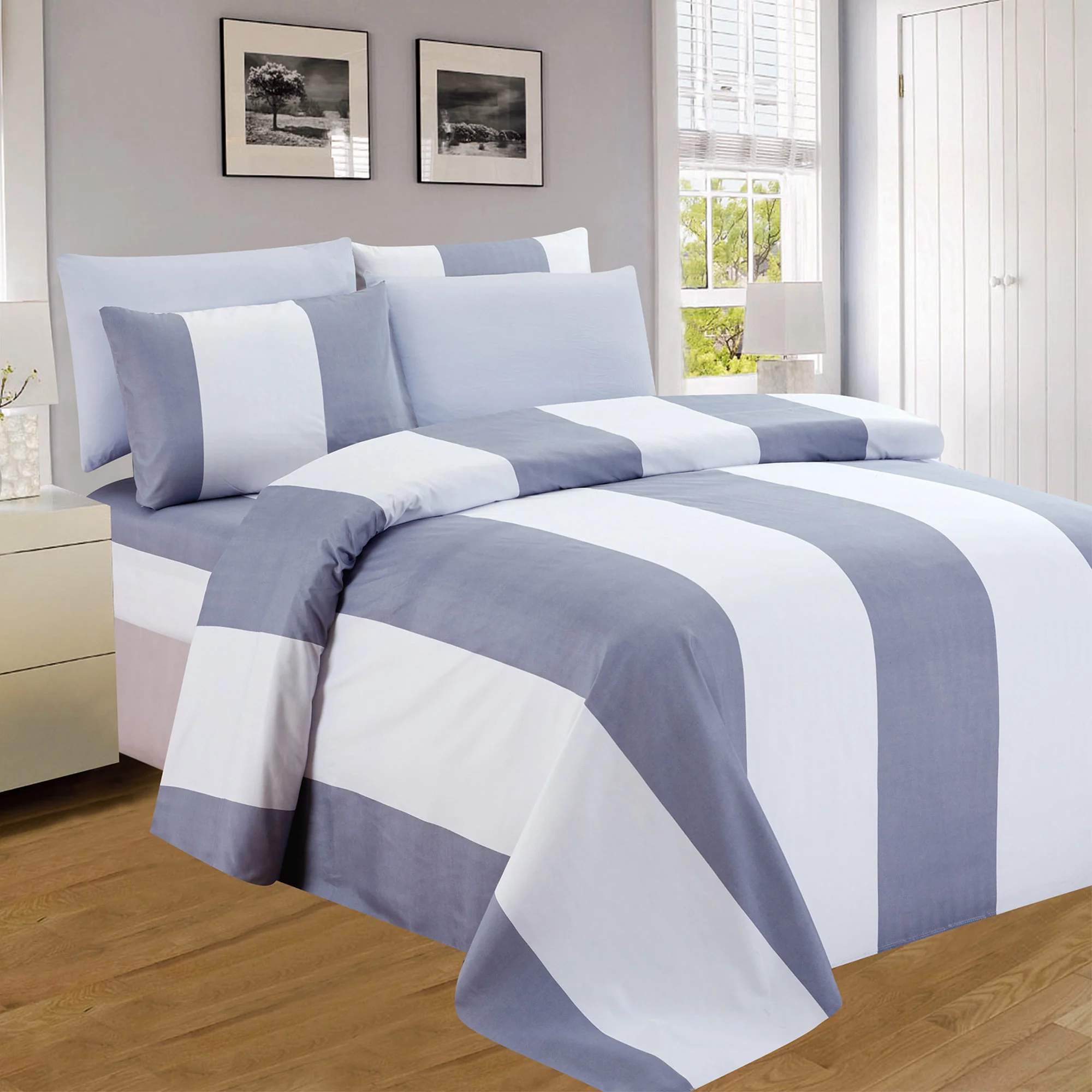 The crisp gray and white striped pattern adds a touch of graphic punch to your bedroom décor, making it perfect for those who love a modern touch.