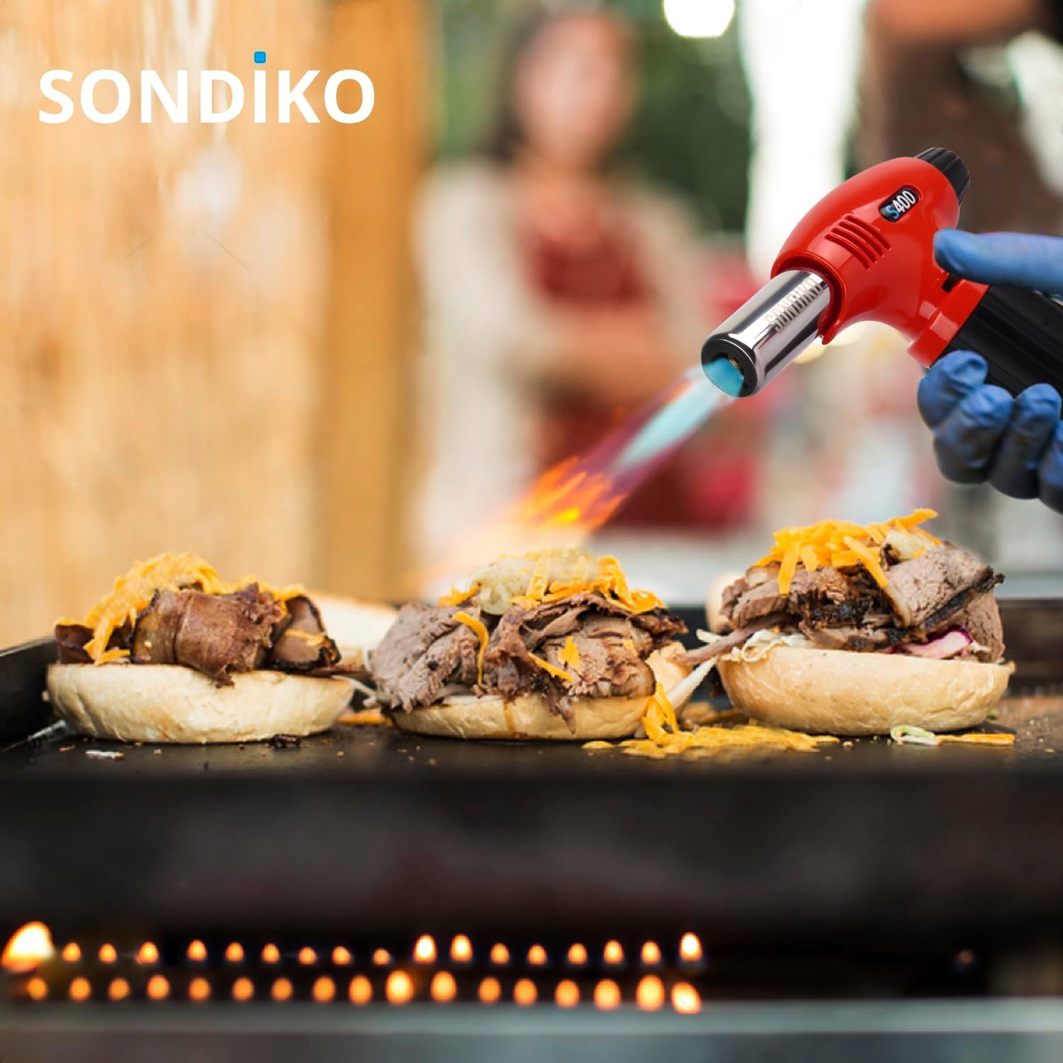 - ►Fits ALL Butane Tanks: Are you still worried about not knowing which tank type to choose? Don’t worry; the Sondiko kitchen butane torch fits any brand of butane gas, whether long nozzle or short nozzle! This torch can be directly modified for the long nozzle gas tank. For a gas tank with a short nozzle, add the red adapter included in the box to lengthen the nozzle, then refill the torch.