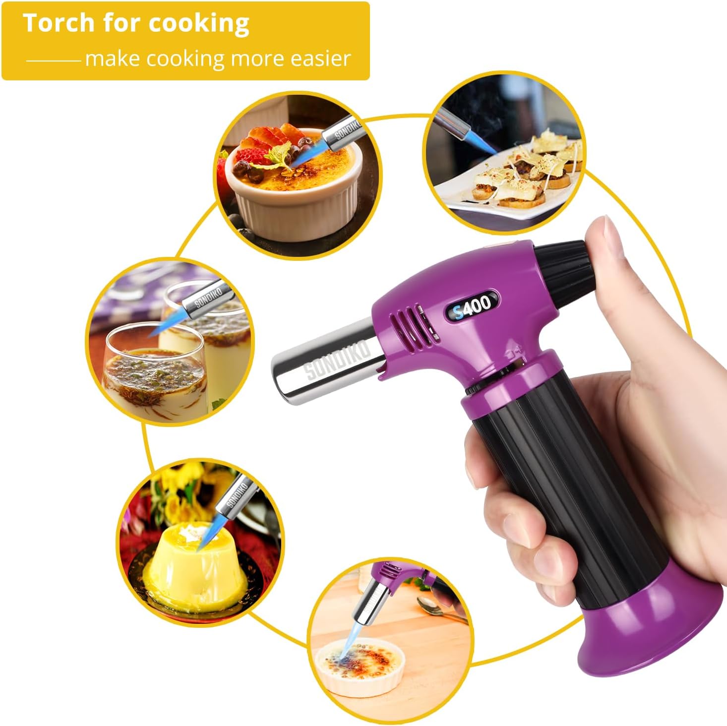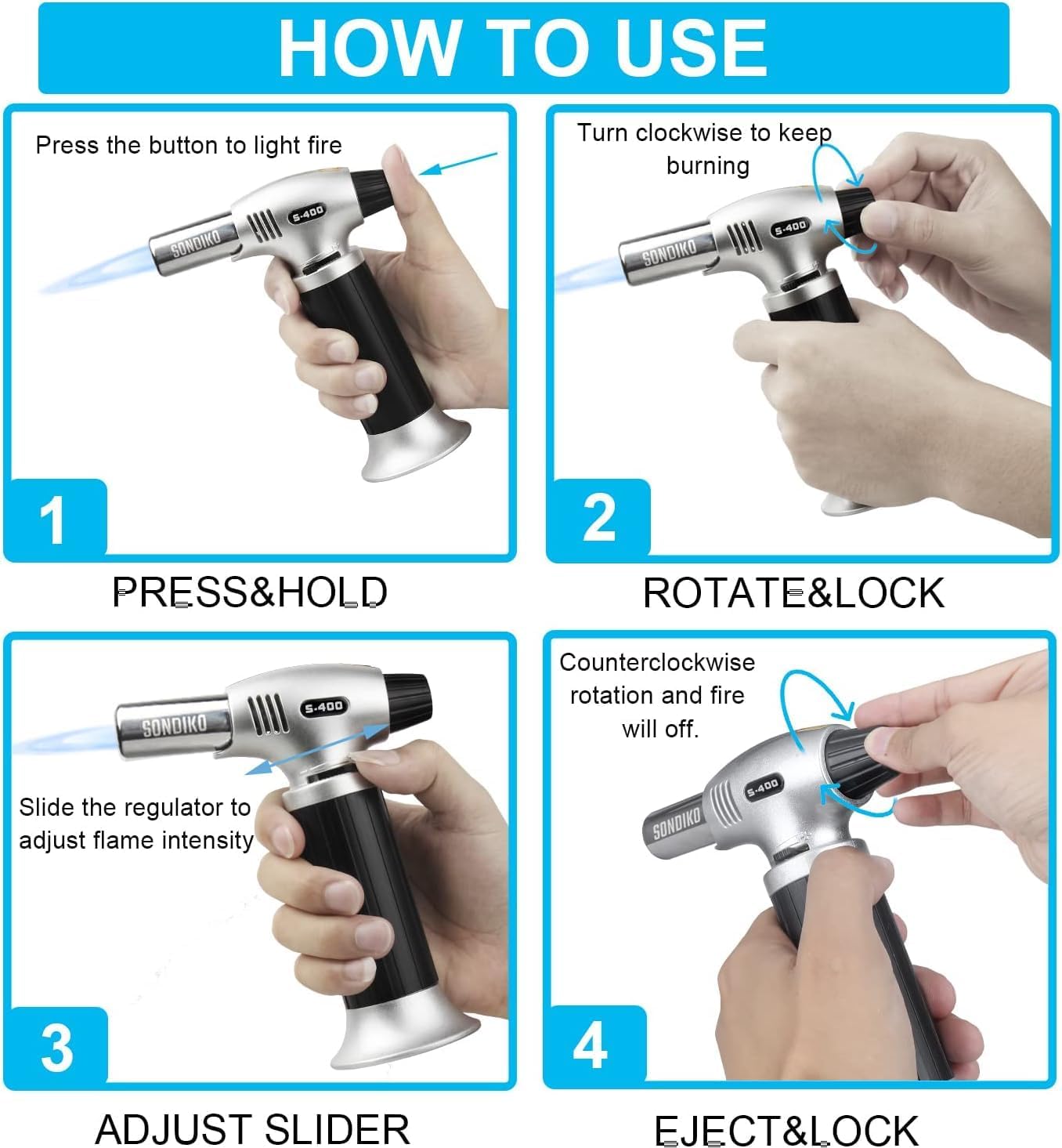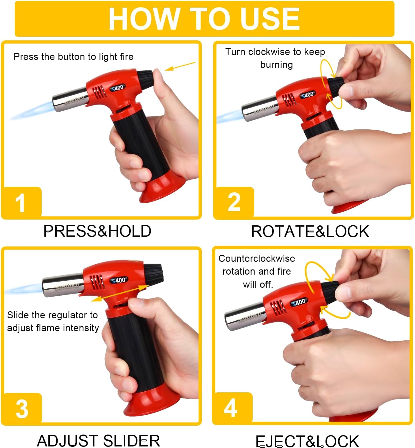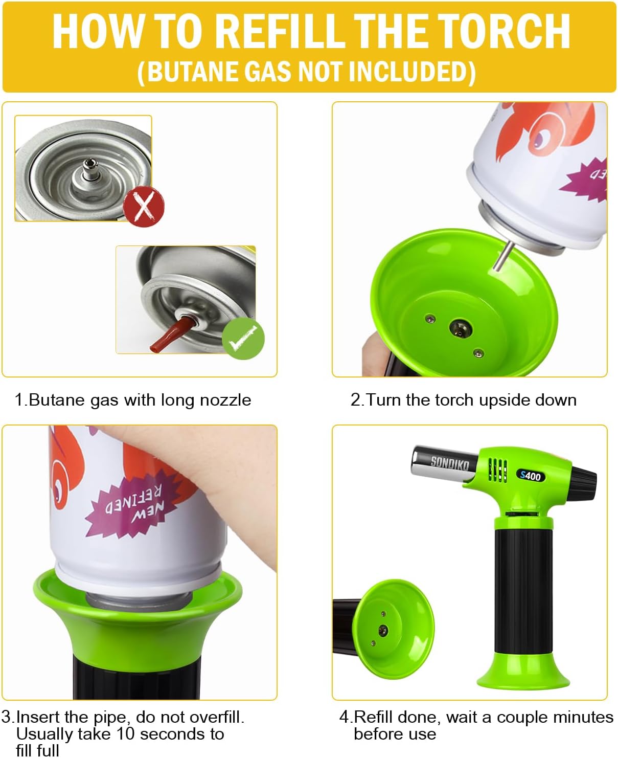 - ►Refillable and Easy to Operate: Refill the kitchen torch with any brand of butane. Please note that butane gas is not included. Simply slide the security lock to open, light up with Piezo Ignition Technology. It is a portable mini torch that you can take for many outdoor activities like camping and BBQ.