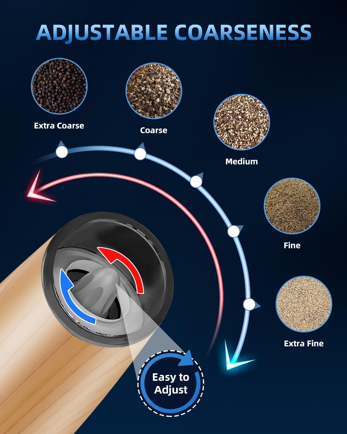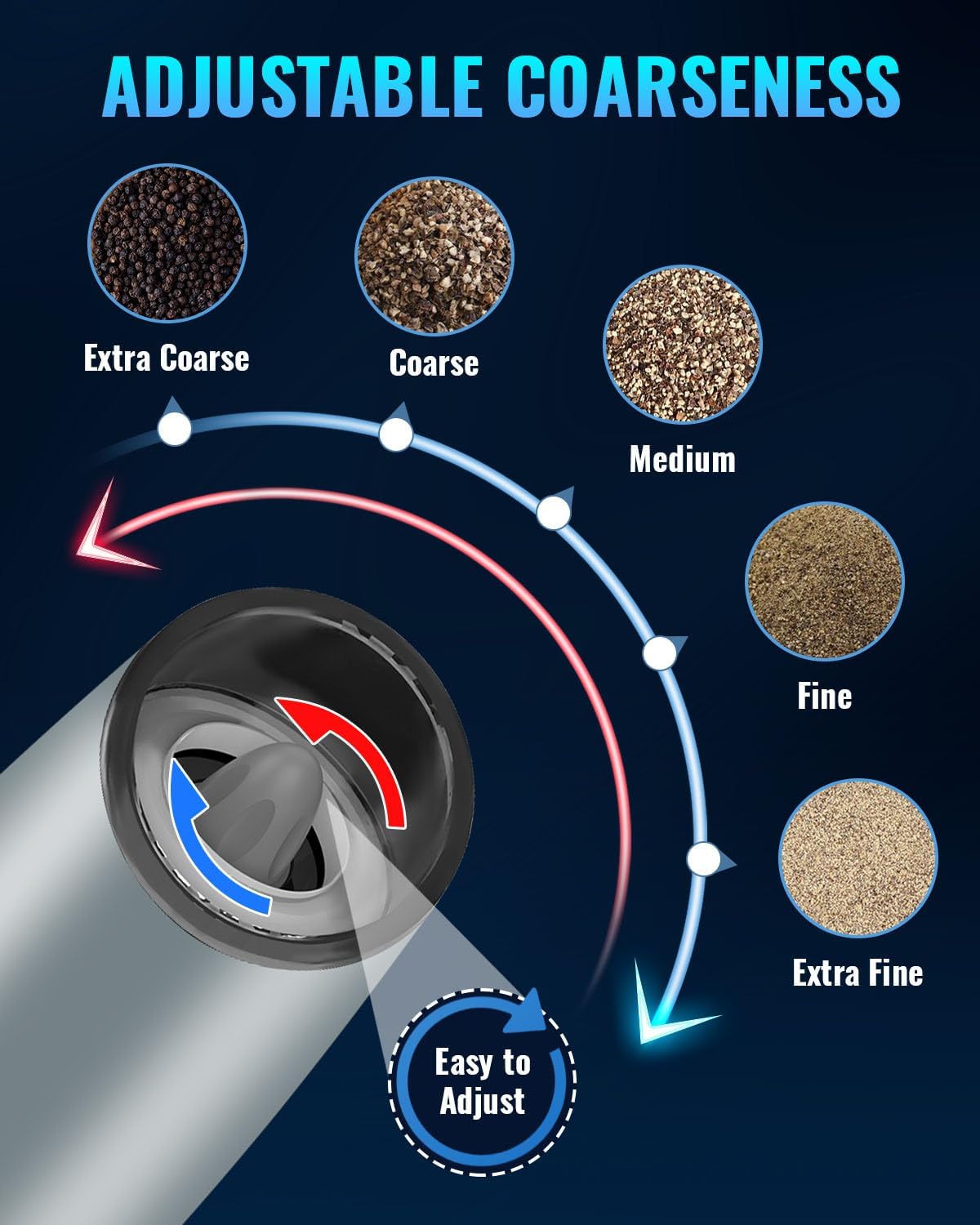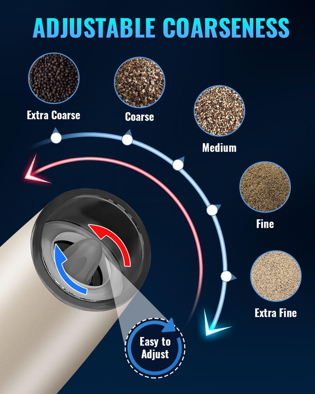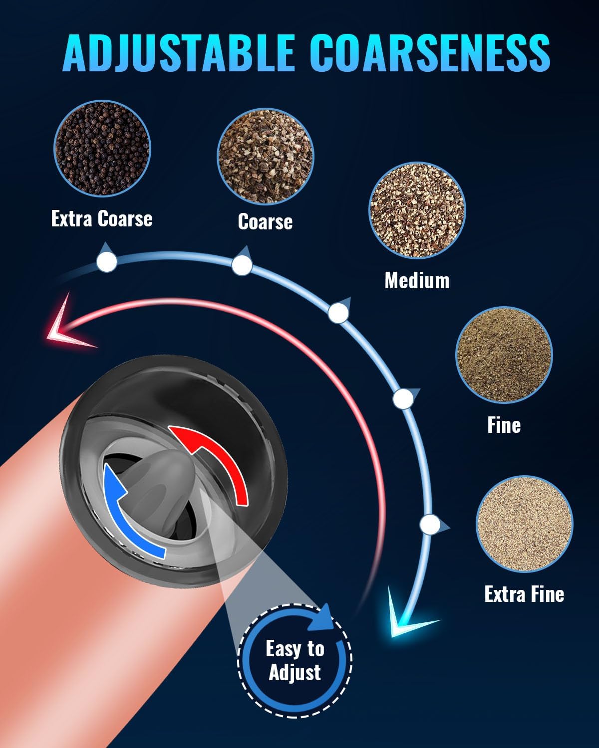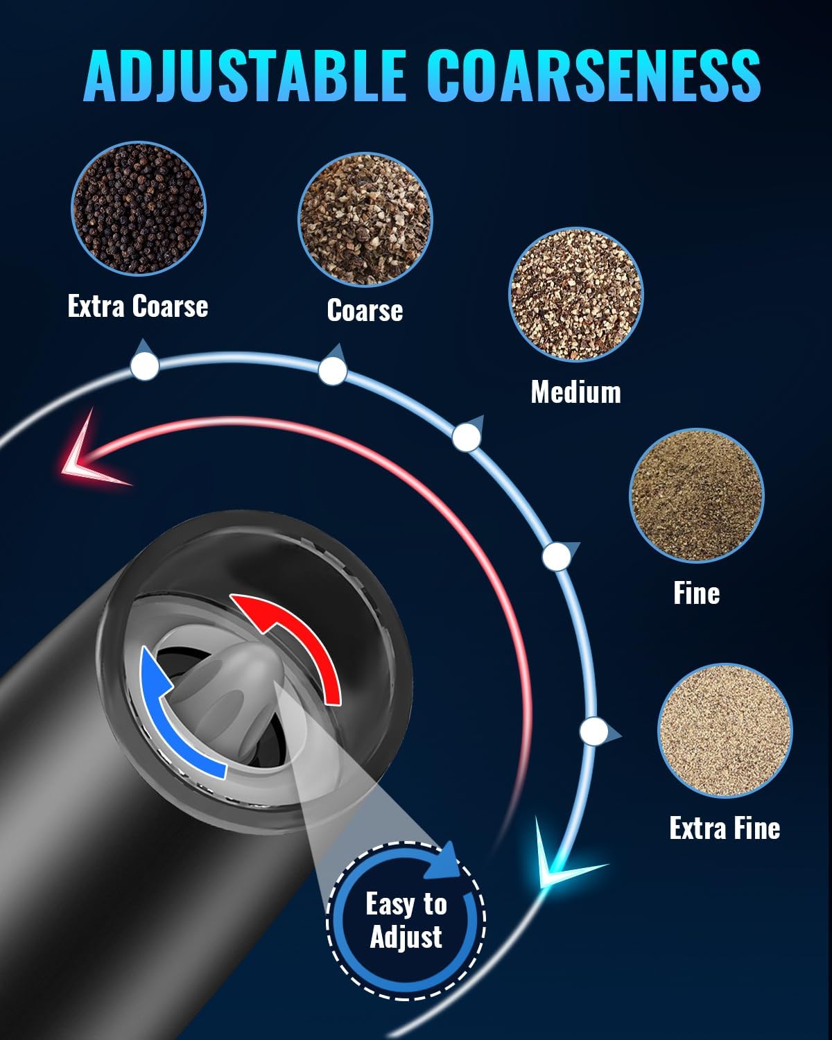 - 【Adjustable Grinder】 Many grinding levels for your choice allows you to grinder your spices from coarse to fine. Electric Pepper and Salt Grinder use a high-quality ceramic rotor. You can choose the coarseness of your spice, salt or pepper by turning adjustment knob at the head of the grinder.