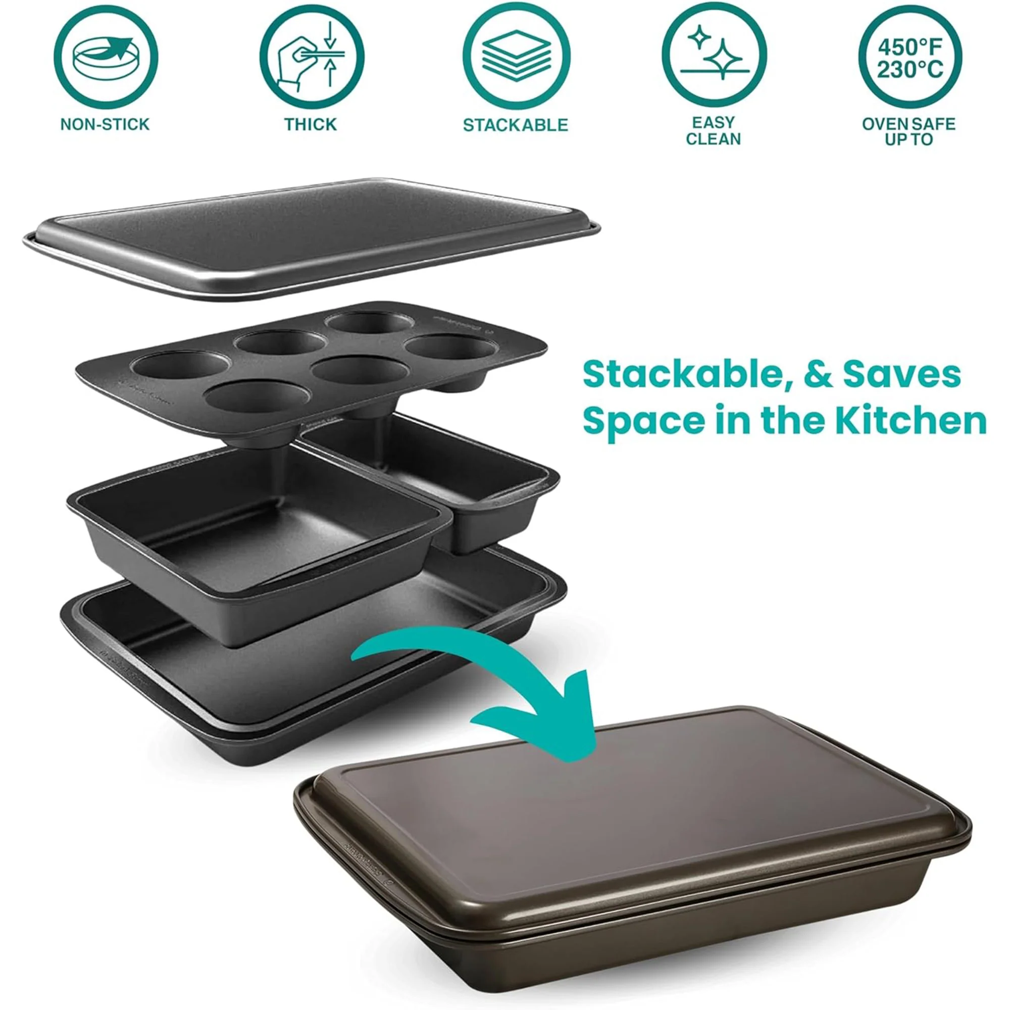 Bakers Secret 5 Piece Essentials Non-Stick Steel Baking Set, Dark Gray