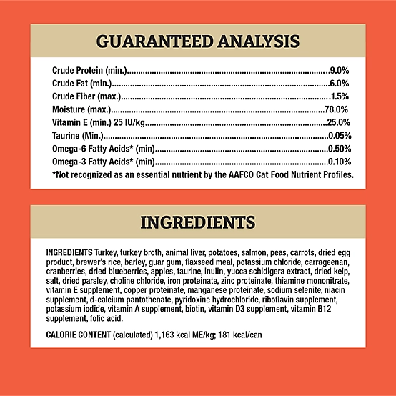 Turkey, Turkey Broth, Liver, Salmon, Dried Egg Product, Brewer's Rice, Dried Potatoes, Barley, Peas, Guar Gum, Flaxseed Meal, Carrageenan, Carrots, Potassium Chloride, Dried Cranberries, Dried Blueberries, Apples, Taurine, Dried Chicory Root, Yucca Schidigera Extract, Dried Kelp, Salt, Dried Parsley, Iron Proteinate, Zinc Proteinate, Vitamin E Supplement, Choline Chloride, Thiamine Mononitrate, Copper Proteinate, Manganese Proteinate, Sodium Selenite, Niacin Supplement, D-Calcium Pantothenate, Pyridoxine Hydrochloride, Riboflavin Supplement, Vitamin A Supplement, Biotin, Potassium Iodide, Vitamin D3 Supplement, Vitamin B12 Supplement, Folic Acid.