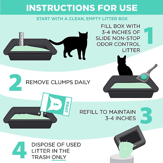 It's time to end scraping and scrubbing with Arm & Hammer SLIDE Easy Clean-Up Clumping Litter. Our revolutionary formula means the litter slides right out of the litter box, making cleanup easy. Plus, Clump & Seal technology seals and destroys odor for a 7-Day Odor-Free Home, Guaranteed. Fellow cat lovers like you put their trust in ARM & HAMMER. Join them and see how quick and easy clean-up can be!1) Start with a clean, empty litter box. 2) Fill with 3-4 inches of ARM & HAMMER Slide Litter. 3) Scoop regularly and add litter to maintain 3-4 inch fill. 4) When it's time to change the litter, ARM & HAMMER Slide Litter pours right out. 5) You may never have to scrape or scrub again!