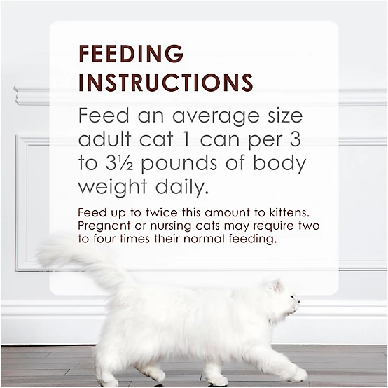 Feed an average size adult cat 1 can per 3 - 3 1/2 pounds of body weight daily. Feed up to twice this amount to kittens. Pregnant or nursing cats may require two to four times their normal feeding.