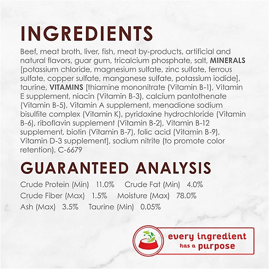 Beef, Meat Broth, Liver, Fish, Meat By-Products, Artificial And Natural Flavors, Guar Gum, Tricalcium Phosphate, Salt, Minerals Potassium Chloride, Magnesium Sulfate, Zinc Sulfate, Ferrous Sulfate, Copper Sulfate, Manganese Sulfate, Potassium Iodide, Taurine, Vitamins Thiamine Mononitrate (Vitamin B-1), Vitamin E Supplement, Niacin (Vitamin B-3), Calcium Pantothenate (Vitamin B-5), Vitamin A Supplement, Menadione Sodium Bisulfite Complex (Vitamin K), Pyridoxine Hydrochloride (Vitamin B-6), Riboflavin Supplement (Vitamin B-2), Vitamin B-12 Supplement, Biotin (Vitamin B-7), Folic Acid (Vitamin B-9), Vitamin D-3 Supplement, Sodium Nitrite (To Promote Color Retention).