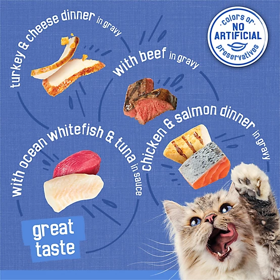 Chicken & Salmon Dinner In Gravy: Water, Chicken, Wheat Gluten, Meat By-Products, Liver, Turkey, Corn Starch-Modified, Soy Flour, Salmon, Artificial And Natural Flavors, Tricalcium Phosphate, MINERALS Potassium Chloride, Zinc Sulfate, Ferrous Sulfate, Manganese Sulfate, Copper Sulfate, Potassium Iodide, Taurine, Salt, Choline Chloride, VITAMINS Thiamine Mononitrate (Vitamin B-1), Vitamin E Supplement, Niacin (Vitamin B-3), Calcium Pantothenate (Vitamin B-5), Vitamin A Supplement, Menadione Sodium Bisulfite Complex (Vitamin K), Pyridoxine Hydrochloride (Vitamin B-6), Riboflavin Supplement (Vitamin B-2), Vitamin B-12 Supplement, Biotin (Vitamin B-7), Folic Acid (Vitamin B-9), Vitamin D-3 Supplement. G612022; Turkey & Cheese Dinner In Gravy: Water, Meat By-Products, Turkey, Wheat Gluten, Chicken, Corn Starch-Modified, Soy Flour, Cheese, Artificial And Natural Flavors, Sodium Caseinate, Vegetable Oil, Tricalcium Phosphate, Corn Starch, MINERALS Potassium Chloride, Zinc Sulfate, Ferrous Sulfate, Manganese Sulfate, Copper Sulfate, Potassium Iodide, Salt, Taurine, Dried Whey, Choline Chloride, Non-Fat Milk, VITAMINS Thiamine Mononitrate (Vitamin B-1), Vitamin E Supplement, Niacin (Vitamin B-3), Calcium Pantothenate (Vitamin B-5), Vitamin A Supplement, Menadione Sodium Bisulfite Complex (Vitamin K), Pyridoxine Hydrochloride (Vitamin B-6), Riboflavin Supplement (Vitamin B-2), Vitamin B-12 Supplement, Biotin (Vitamin B-7), Folic Acid (Vitamin B-9), Vitamin D-3 Supplement. H612122; With Ocean Whitefish & Tuna In Sauce: Water, Chicken, Wheat Gluten, Liver, Meat By-Products, Ocean Whitefish, Corn Starch-Modified, Soy Flour, Tuna, Artificial And Natural Flavors, Tricalcium Phosphate, MINERALS Potassium Chloride, Magnesium Proteinate, Zinc Sulfate, Ferrous Sulfate, Manganese Sulfate, Copper Sulfate, Potassium Iodide, Taurine, Choline Chloride, Salt, VITAMINS Thiamine Mononitrate (Vitamin B-1), Vitamin E Supplement, Niacin (Vitamin B-3), Calcium Pantothenate (Vitamin B-5), Vitamin A Supplement, Menadione Sodium Bisulfite Complex (Vitamin K), Pyridoxine Hydrochloride (Vitamin B-6), Riboflavin Supplement (Vitamin B-2), Vitamin B-12 Supplement, Biotin (Vitamin B-7), Folic Acid (Vitamin B-9), Vitamin D-3 Supplement. G612422; With Beef In Gravy: Water, Liver, Chicken, Beef, Wheat Gluten, Turkey, Fish, Corn Starch-Modified, Soy Flour, Artificial And Natural Flavors, Tricalcium Phosphate, MINERALS Potassium Chloride, Zinc Sulfate, Ferrous Sulfate, Manganese Sulfate, Copper Sulfate, Potassium Iodide, Taurine, Salt, Choline Chloride, VITAMINS Thiamine Mononitrate (Vitamin B-1), Vitamin E Supplement, Niacin (Vitamin B-3), Calcium Pantothenate (Vitamin B-5), Vitamin A Supplement, Menadione Sodium Bisulfite Complex (Vitamin K), Pyridoxine Hydrochloride (Vitamin B-6), Riboflavin Supplement (Vitamin B-2), Vitamin B-12 Supplement, Biotin (Vitamin B-7), Folic Acid (Vitamin B-9), Vitamin D-3 Supplement. G612222