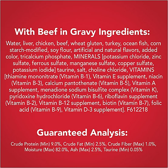 Water Sufficient for Processing, Liver, Chicken, Beef, Wheat Gluten, Turkey, Ocean Fish, Corn Starch-Modified, Soy Flour, Artificial and Natural Flavors, Added Color, Calcium Phosphate, Potassium Chloride, Taurine, Salt, Choline Chloride, Zinc Sulfate, Thiamine Mononitrate, Vitamin E Supplement, Ferrous Sulfate, Niacin, Copper Sulfate, Manganese Sulfate, Calcium Pantothenate, Vitamin A Supplement, Menadione Sodium Bisulfite Complex (Source of Vitamin K Activity), Pyridoxine Hydrochloride, Riboflavin Supplement, Vitamin B-12 Supplement, Biotin, Folic Acid, Vitamin D-3 Supplement, Potassium Iodide.