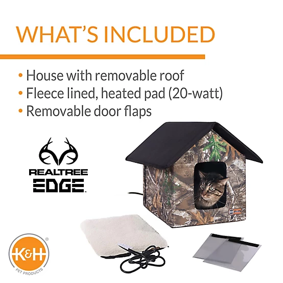 The K&H Pet Products Outdoor Heated Kitty House Cat Shelter is available in both heated and unheated models and is the original outdoor heated kitty house. The cozy heated cat house is perfect for cats who prefer the outdoors, and for feral cats. The featured 20 Watt MET safety listed plush heated pet bed inside the K&H outdoor heated kitty house keeps your kitties warm -- even in sub-zero temperatures. This cat shelter is perfect for cats that prefer to sleep in garages, porches, barns, or even in colder parts of the house. Two exits include removable clear door flaps to protect cats from the harsh elements of winter, and the heated pad cover is conveniently removable and washable for continual use.
