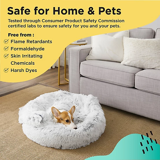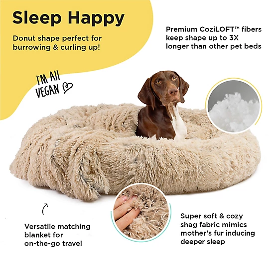 Give your pet more than just a dog bed! Best Friend's by Sheri is the original creator of the most popular dog bed that has surfaced the internet in recent years: The Calming Donut Dog Bed. This innovative cuddler shag design provides better sleep, supports joints, and offers a calming, self-warming effect. The donut cuddler is carefully crafted and filled with CoziLOFT fibers, allowing your pet to be instantly enveloped in premium, soft, luxurious comfort. The poly filling in our calming dog bed keeps its loft for up to 3Xs longer than standard pet beds, meaning it provides longer comfort, support and aesthetic appeal. Encouraging a deeper night's rest or a refreshing daytime nap, our soothing dog bed is special because it's been carefully designed to provide optimal neck, joint, and muscle support. For dogs and cats who like to burrow, the bed creates a perfect space for cuddles and top-notch snuggling. With a water and dirt-resistant bottom, our calming pet bed helps prevent messes from reaching your floors. When accidents happen, toss the shell into the washing machine for easy clean up. SAFETY & CARE: FOR PET USE ONLY. This is not a chew toy. Inspect regularly and discard if any part becomes damaged or separated. May be harmful if ingested. If item becomes wet, some color transfer may occur. Use caution around light-colored upholstery or carpeting.