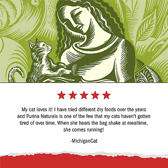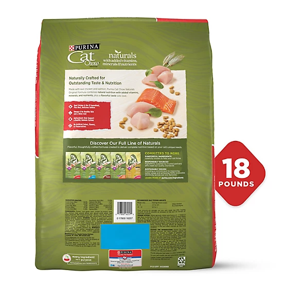 Serve your cat a great tasting meal with the Purina Cat Chow Purina Cat Chow Naturals With Added Vitamins, Minerals and Nutrients Dry Cat Food. This recipe features nutrition made with high-quality ingredients, like real chicken as the #1 ingredient. Our wholesome cat food is also made with real salmon and whole grains. Formulated for all life stages, this delicious dry cat food follows your cat through her kitten and adult years. Made without artificial flavors, colors and preservatives, this recipe delivers more of the ingredients you want without the ones you don't. Your cat gets 100 percent complete and balanced dry cat food at mealtime, and you get the comfort that comes from giving her a natural cat food backed by a trusted brand. With 25 essential vitamins and minerals in every bag, this dry cat food gives her the nutrition she needs to help her live a long, happy life with you. Make this meal a part of her daily feeding routine and show your cat you care about her health and wellness.