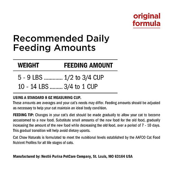 • Feeding for Reproduction: Purina Cat Chow Naturals provides the extra nutrition needed by reproducing females in stages of gestation and lactation. Food consumption may vary during gestation, so feed the amount needed to maintain the pregnant female's good body condition. Food intake may double or even quadruple during lactation.