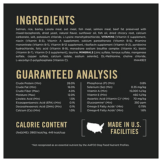 Salmon, Rice, Barley, Canola Meal, Oat Meal, Fish Meal, Salmon Meal, Beef Fat Preserved With Mixed-Tocopherols, Dried Yeast, Natural Flavor, Sunflower Oil, Fish Oil, Dried Chicory Root, Calcium Carbonate, Salt, Potassium Chloride, L-Lysine Monohydrochloride, Vitamins Vitamin E Supplement, Niacin (Vitamin B-3), Vitamin A Supplement, Calcium Pantothenate (Vitamin B-5), Thiamine Mononitrate (Vitamin B-1), Vitamin B-12 Supplement, Riboflavin Supplement (Vitamin B-2), Pyridoxine Hydrochloride, Folic Acid (Vitamin B-9), Menadione Sodium Bisulfite Complex (Vitamin K), Biotin (Vitamin B-7), Vitamin D-3 Supplement, Taurine, Minerals Zinc Sulfate, Ferrous Sulfate, Manganese Sulfate, Copper Sulfate, Calcium Iodate, Sodium Selenite, Dl-methionine, Choline Chloride, L-Ascorbyl-2-Polyphosphate (Vitamin C). M444922