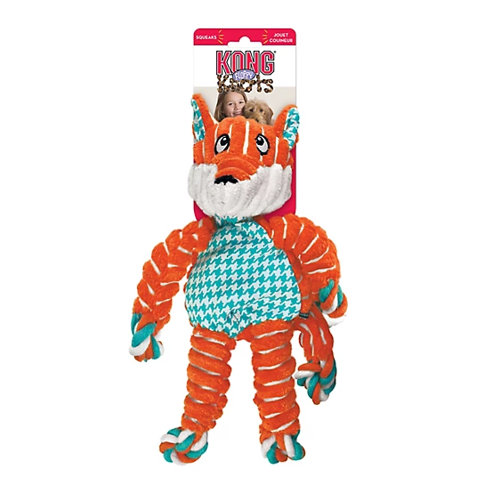 The KONG Floppy Knots Fox Dog Toy is the newest arrival in the Knots tribe with a cheerful, floppy design, allowing for great thrashing fun. The realistic feel of the internal knotted rope satisfies natural instincts, while the varied textures and squeakers gear up for play. With minimal stuffing for less mess, get ready for entertaining games and grins. The dog toy/squeaky toy is available in orange/white/blue.