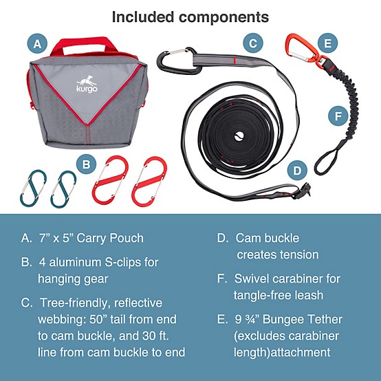 - Dog tie out includes 30 ft. of zipline, 9 3/4 in. bungee tether, 4 aluminum s-clips, and 7 in. x 5 in. carry pouch
