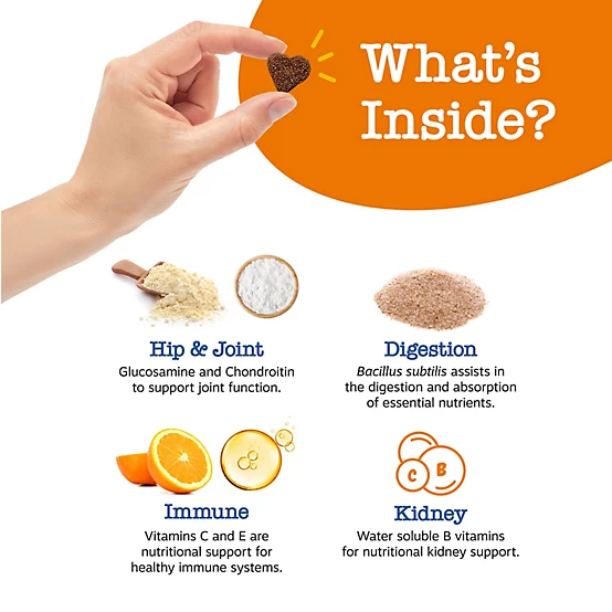 - Hip, Joint & Performance Support - Contains Glucosamine HCl and Chondroitin Sulfate for hip and joint support, while B-Complex vitamins support electrolyte balance and cellular energy production.