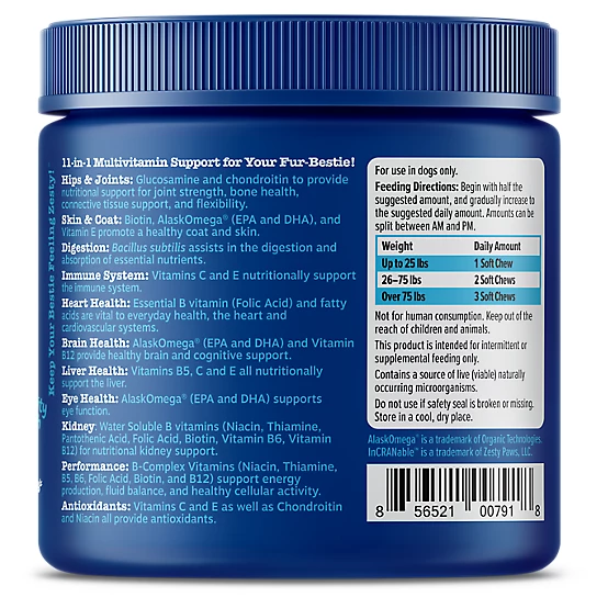 - Senior Advanced Dog Multivitamin 11-in-1 Multivitamin Bites are soft chews that support performance, joints, heart, immune system, urinary tract, skin and coat, brain, eye, liver, and digestive health.