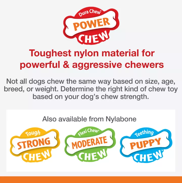 Give your dog something fun to chew on! Made from our toughest material, this Power Chew durable dog chew toy entertains extreme chewers and encourages non-destructive chewing habits. It features delicious flavor dogs love throughout, giving your furry friend even more to smile about. Speaking of smiles, this chew toy also helps clean teeth and control plaque & tartar as dogs chew. Satisfy your best friend's natural urge to chew with this this occupying, USA-made chew toy! What your dog chews matters! With destructive behavior among the leading reasons dogs are returned to shelters, we know healthy habits can make a life-changing difference. For 70 years, our family-founded brand continues to safely satisfy dogs' chewing instincts and help them stay in loving forever homes!
