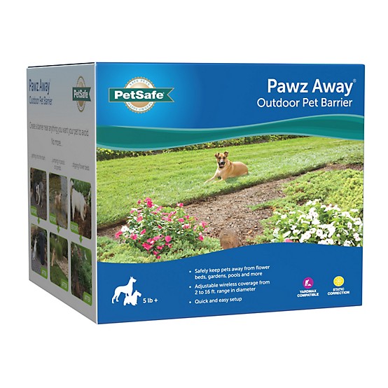 Keep your pets out of flower beds, water features and other outdoor spaces with the PetSafe Pawz Away Outdoor Pet Barrier system. The system comes with a cleverly disguised transmitter that blends into your landscape plus a receiver collar for your pet. When your pet enters the barrier zone you set up, the transmitter sends a safe static correction to his receiver collar. The system has a wireless setup option that protects a circular area up to 16 ft. away. You can also create a custom shaped barrier using up to 150 ft. of boundary wire (sold separately). You can add an unlimited number of pets to the system if they're wearing a PetSafe Pawz Away Receiver Collar (additional collars sold separately). You can also set up an unlimited number of "off limits" areas with additional collars. Trust PetSafe to help keep your pet healthy, safe and happy.