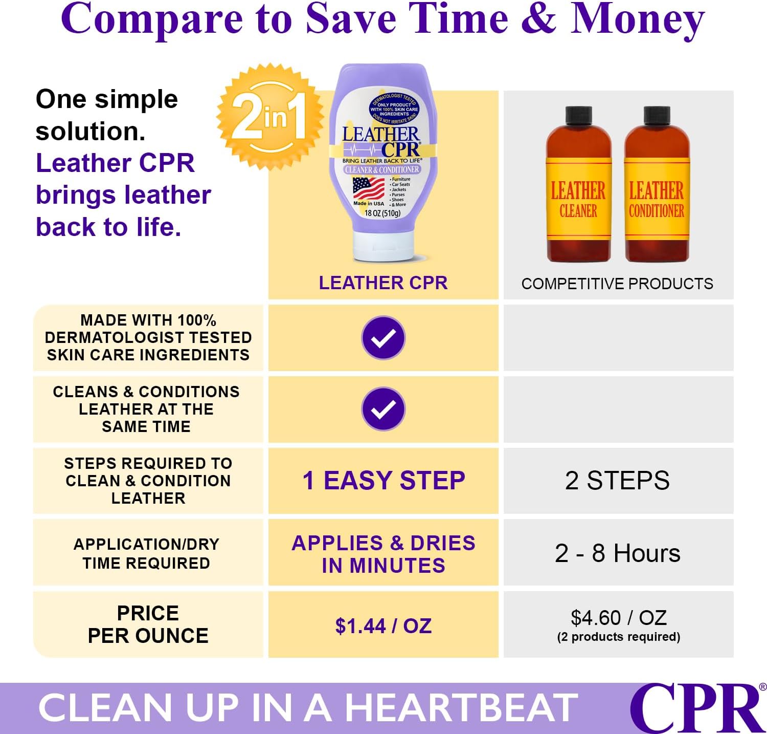 - ALL-PURPOSE LEATHER CARE - Whether you’re searching for a sofa leather cleaner, an artificial leather cleaner for car interiors, or other leather items, Leather CPR won’t disappoint.