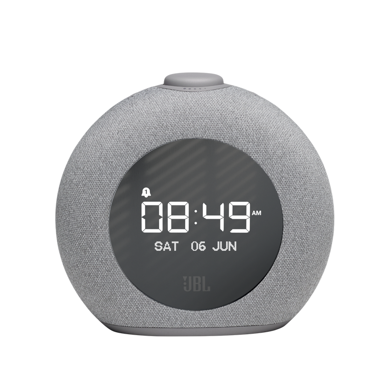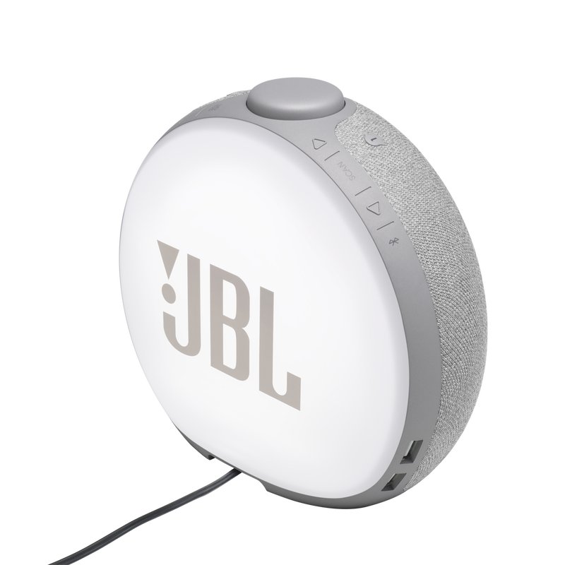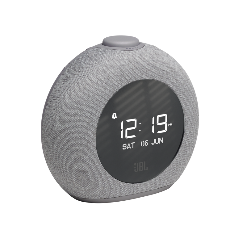 Wake up to JBL Pro Sound. With its signature round design, ambient LED light and FM radio, JBL Horizon 2 completes any bedroom. A large LCD display clearly shows the time, alarm settings and radio info, while the lifestyle fabric cover blends perfectly with any decor. Choose from a selection of alarm tones or one of your favorite FM radio stations. The easy-to-use rotary control knob lets you set and snooze alarms, adjust the volume or turn the ambient light on and off. Complete with two convenient USB ports for charging your devices, JBL Horizon 2 is the perfect bedside companion.