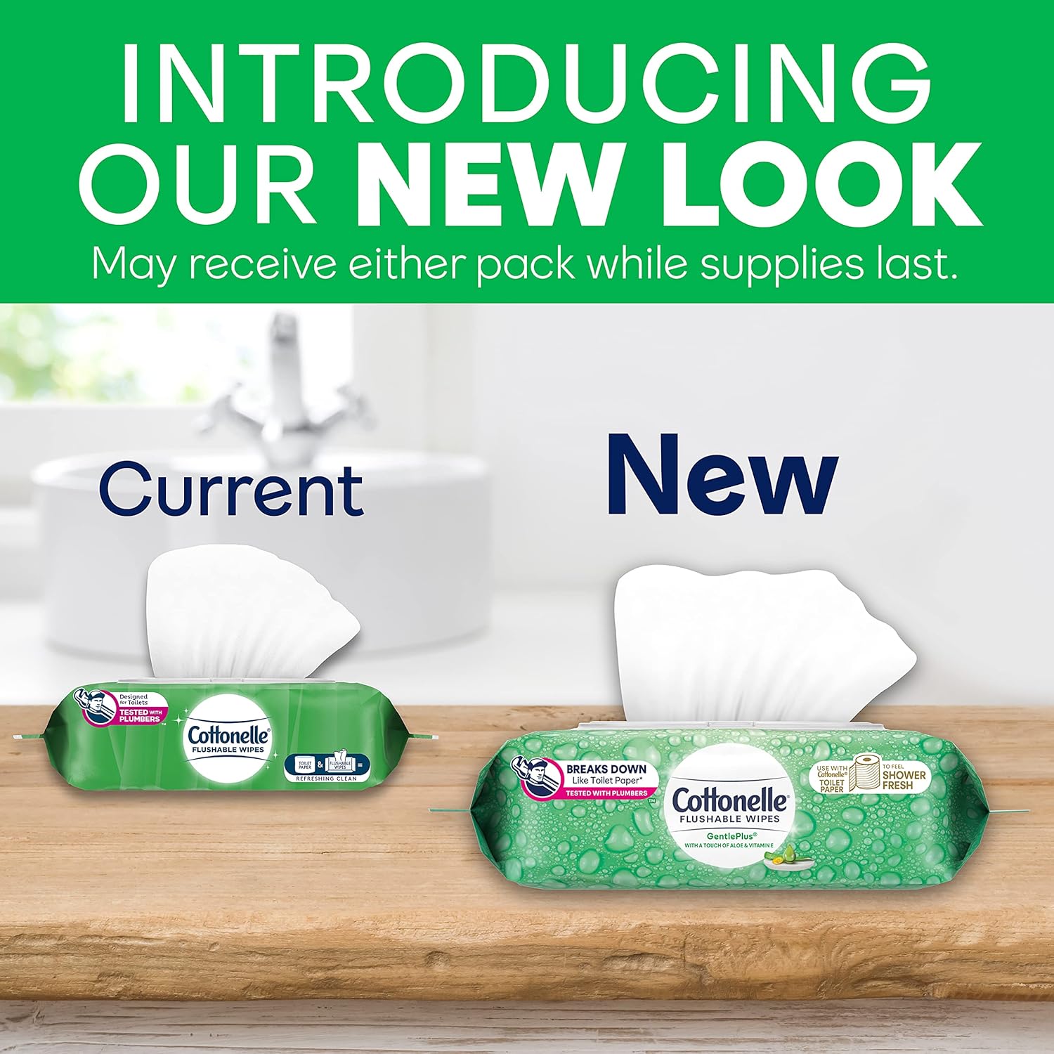 - 6 flip-top pack of Cottonelle GentlePlus Flushable Wet Wipes with Aloe & Vitamin E, 42 flushable wipes per pack (252 wipes total)