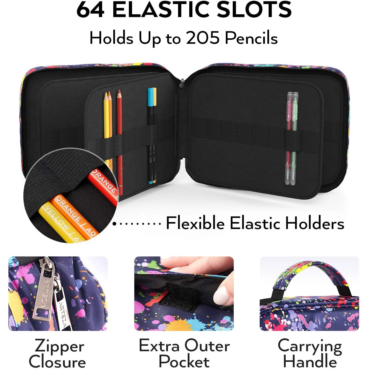 Keep your art supplies organized and protected with the ARTEZA Pencil Case Organizer. This versatile pencil case features 64 elastic slots that can hold up to 205 pencils, pens, markers, and other art supplies. The paint splatter pattern adds a fun and stylish touch to your art supplies.