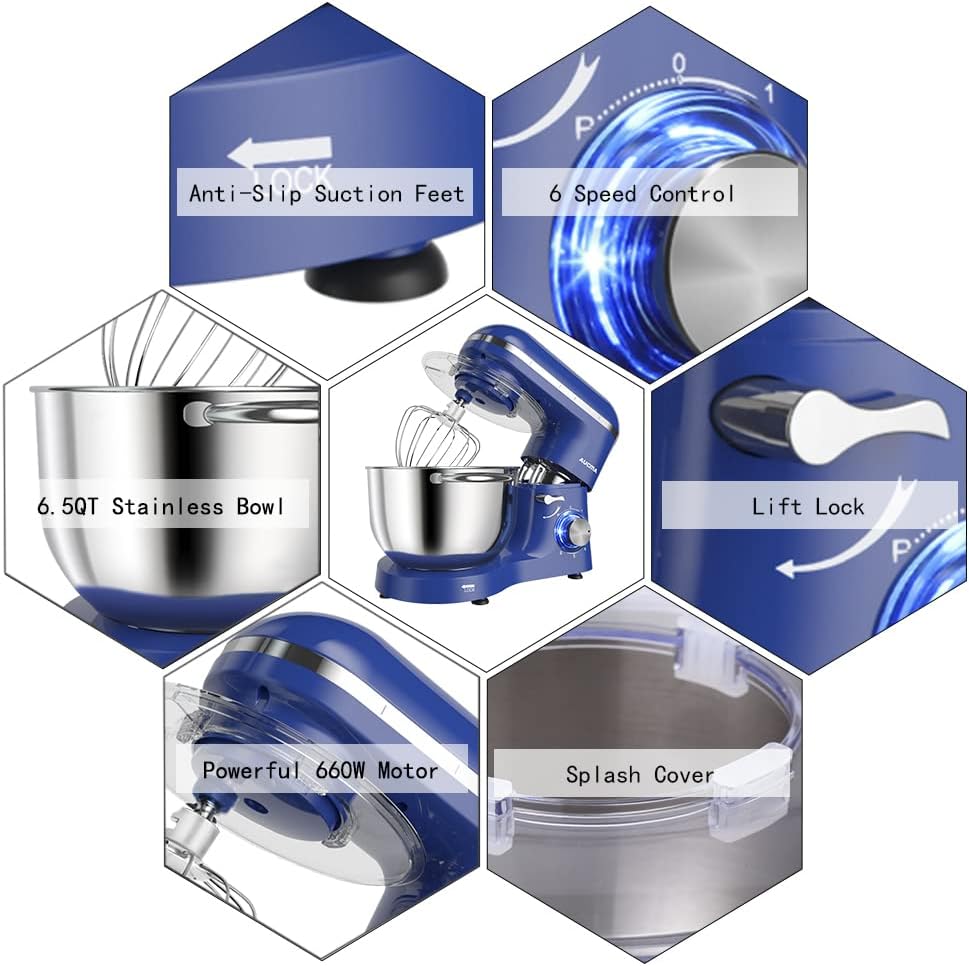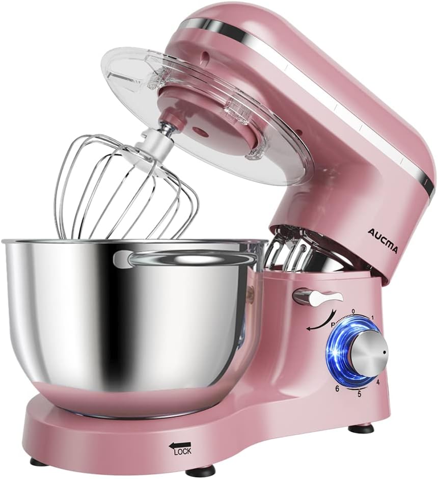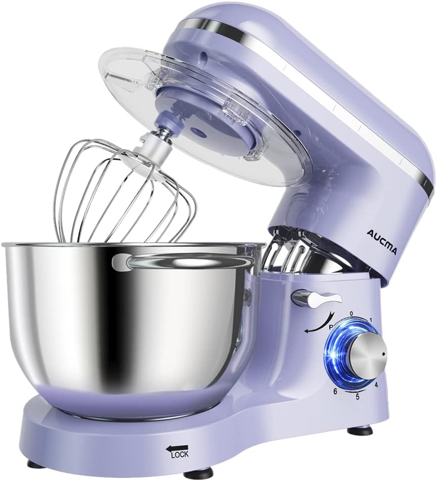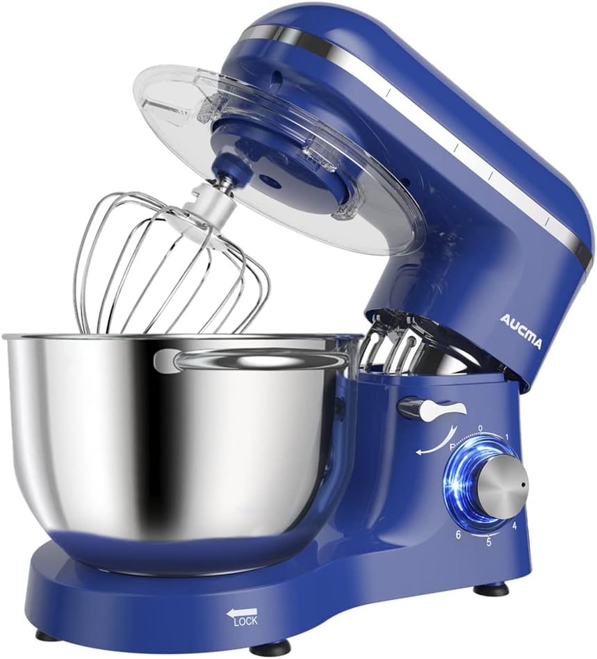Aucma Electric Food Stand Mixer is designed for hands-free mixing for a wide variety of foods ranging from light and airy egg whites to sticky bread dough. A powerful 660 Watt motor is great for everyday mixing and can even handle the thickest cookie dough. 6-speed mixer for all your food preparation needs. Ensures perfect mixing results every time. Non-slip feet keep the mixer still in using, and the splatter shield guards against messy drips, drops, and spills. Attachments include a whisk, mixing beater, dough hook and splash guard.