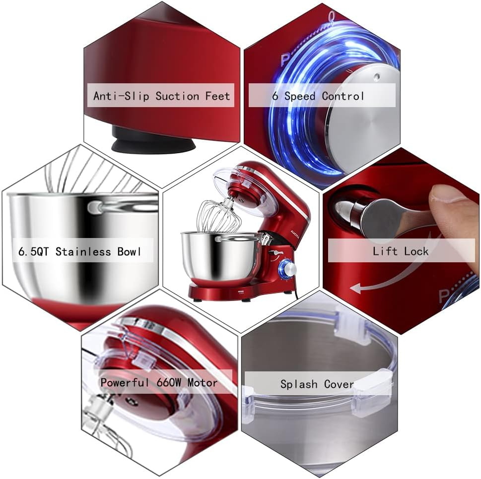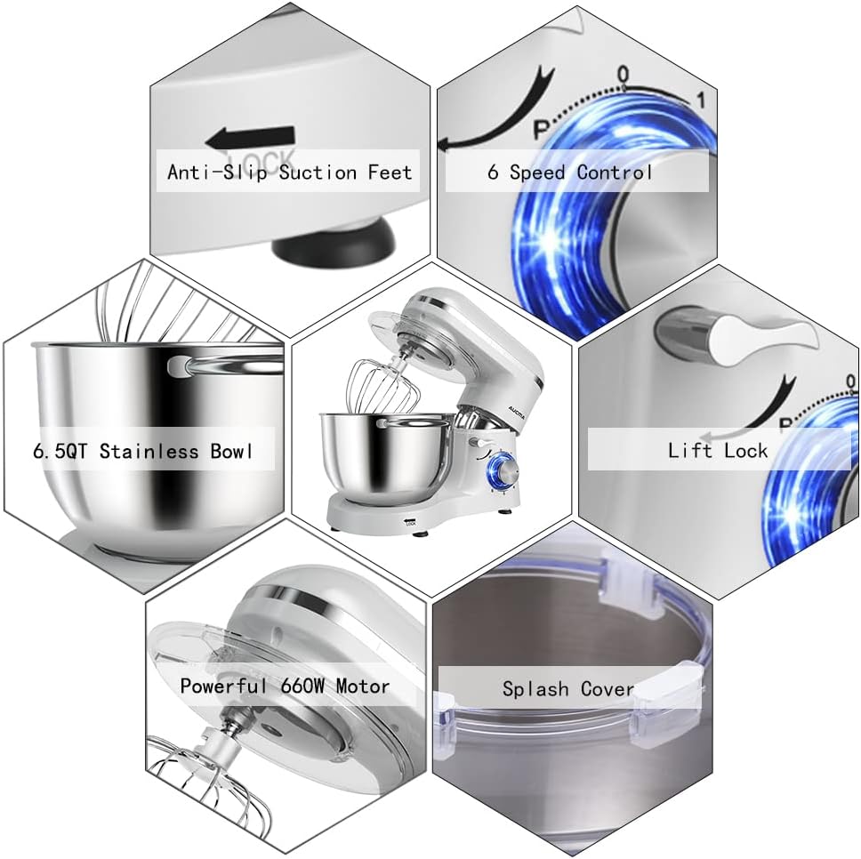 • Multiple Attachment Set - Aucma stand mixer comes with three mixing accessories: whisk, dough hook, mixing beater.The splash guard with access hatch helps add ingredients without making a mess.