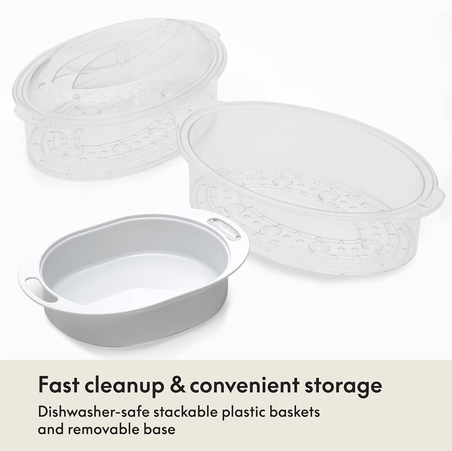 - STACKABLE BASKETS & REMOVABLE BASE: The removable base makes it easy to clean your electric cooker and veggie steamer. The stackable Plastic baskets make it easy to store your food once it's done and can be removed safely washed in your dishwasher