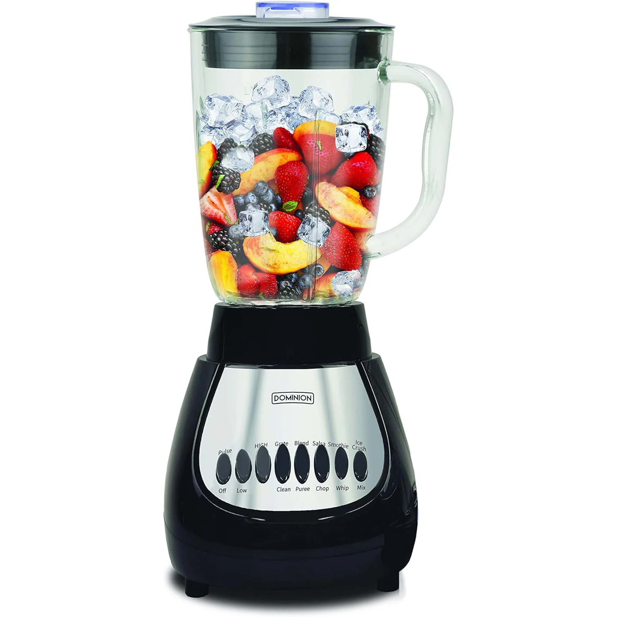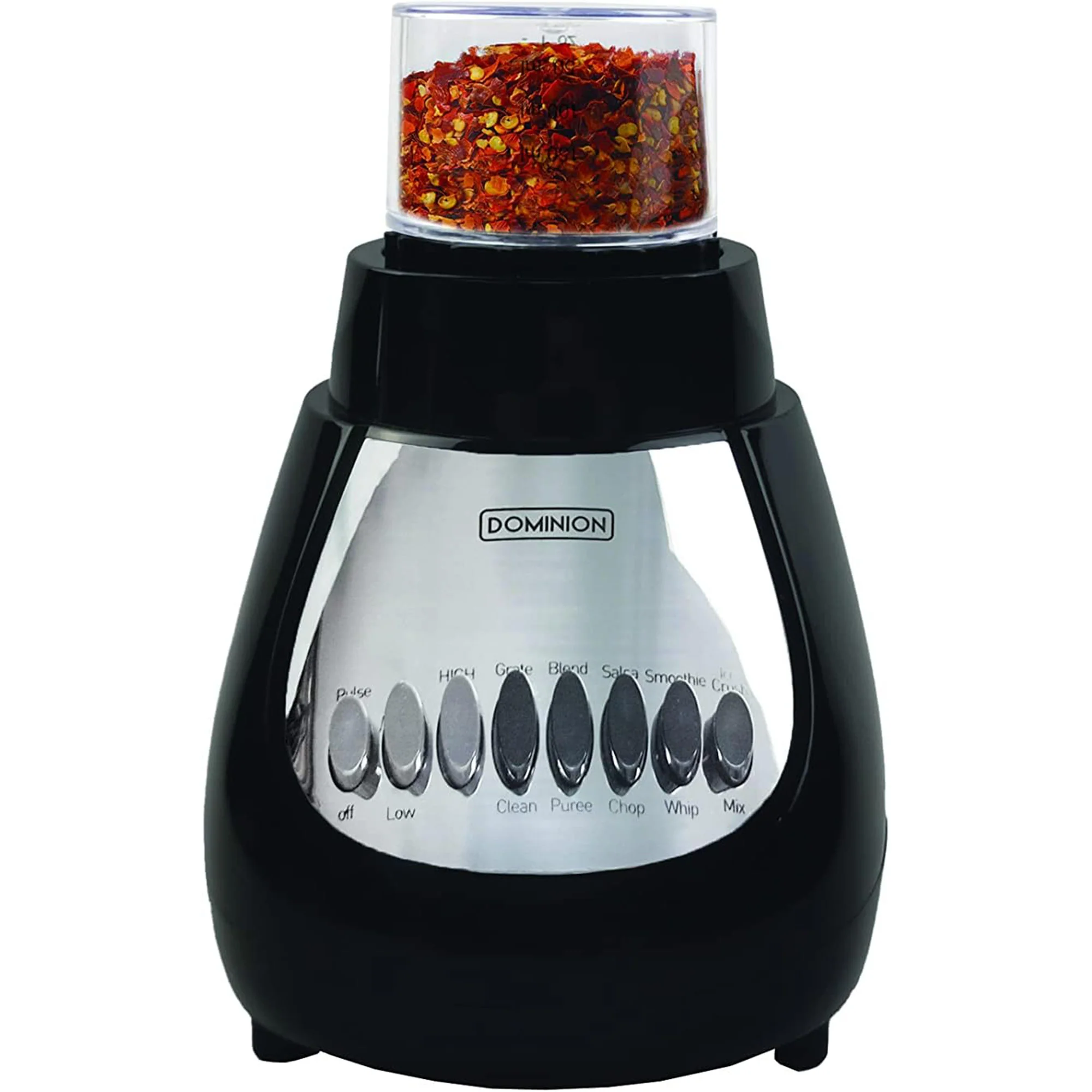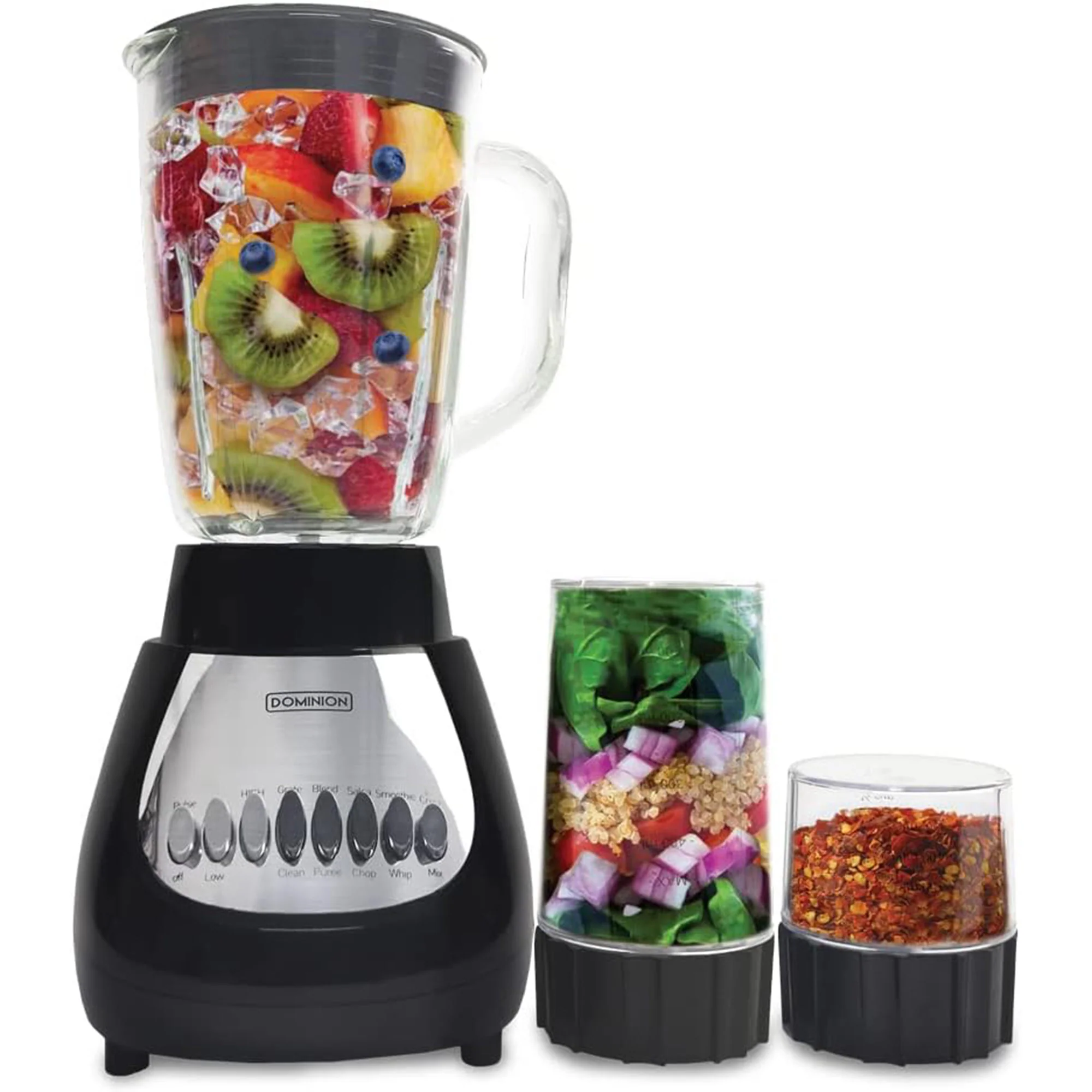 The Dominion BlendMax Blender, Chopper, and Grinder trio takes your blending options two steps further, letting you blend in the larger-capacity jar or convert to a convenient chopper or personal grinder. Whether you’re crushing ice for shakes and smoothies using the larger capacity jar, preparing vegetables, salsa, using the detachable chopper, or crushing nuts / coffee beans with the personal grinder, Dominion has you FULLY covered with three appliances in one. Its 600 peak watt motor starts with a boost of extra power, moving ingredients down into the blade to ensure smooth blending and multiple speeds provide plenty of options for just the right consistency. This unit is equipped with a multi-level blending blade allowing you to effortlessly crushes ice and works through ingredients with ease.
