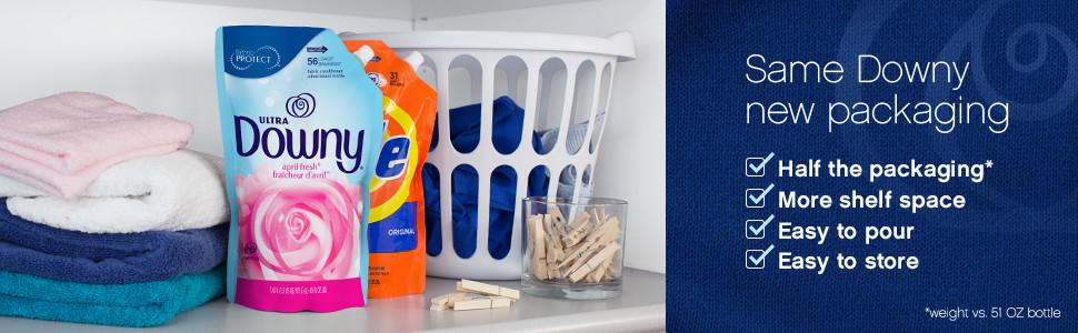 - With half the packaging (versus 51 OZ bottle), Downy Pouch is easy to pour and easy to store