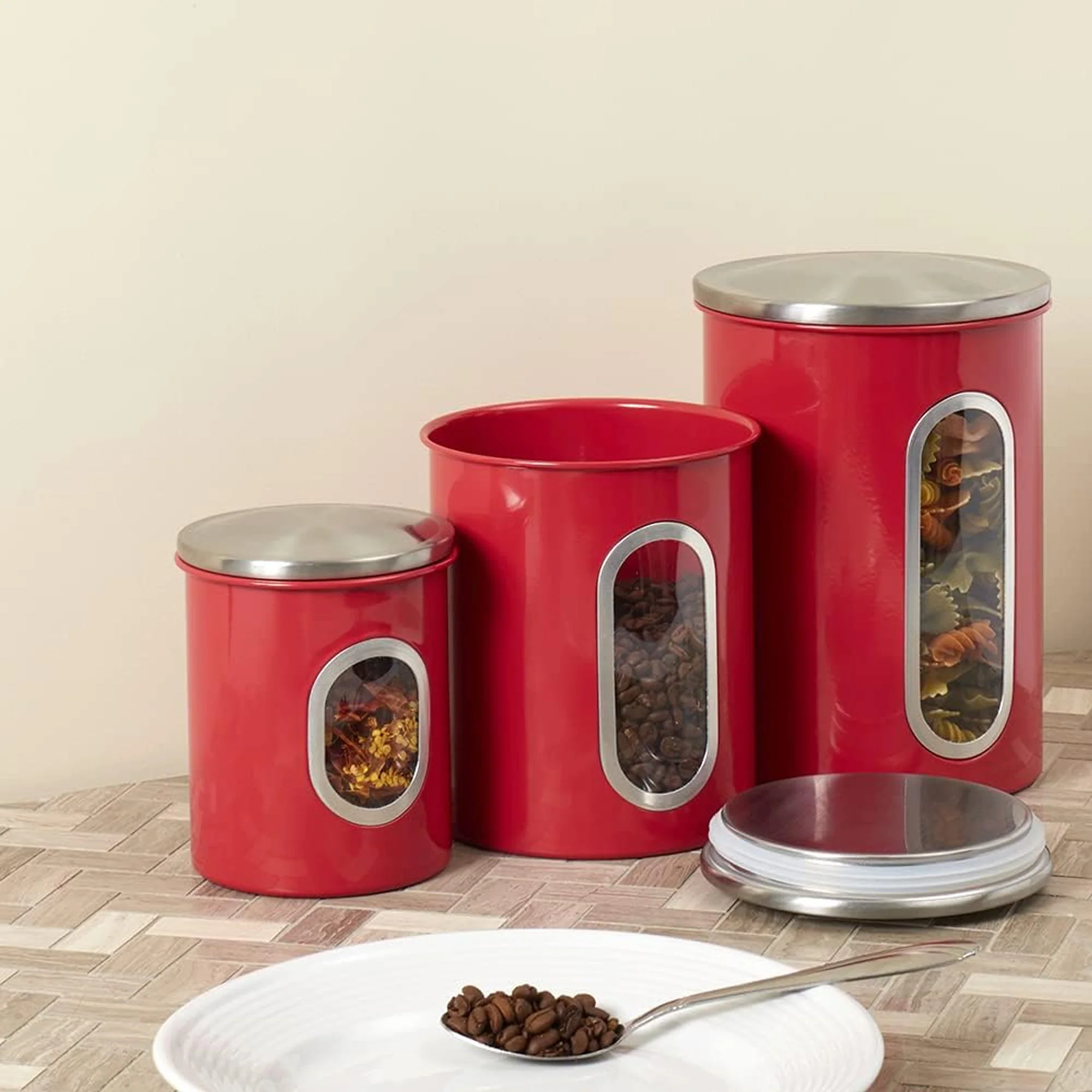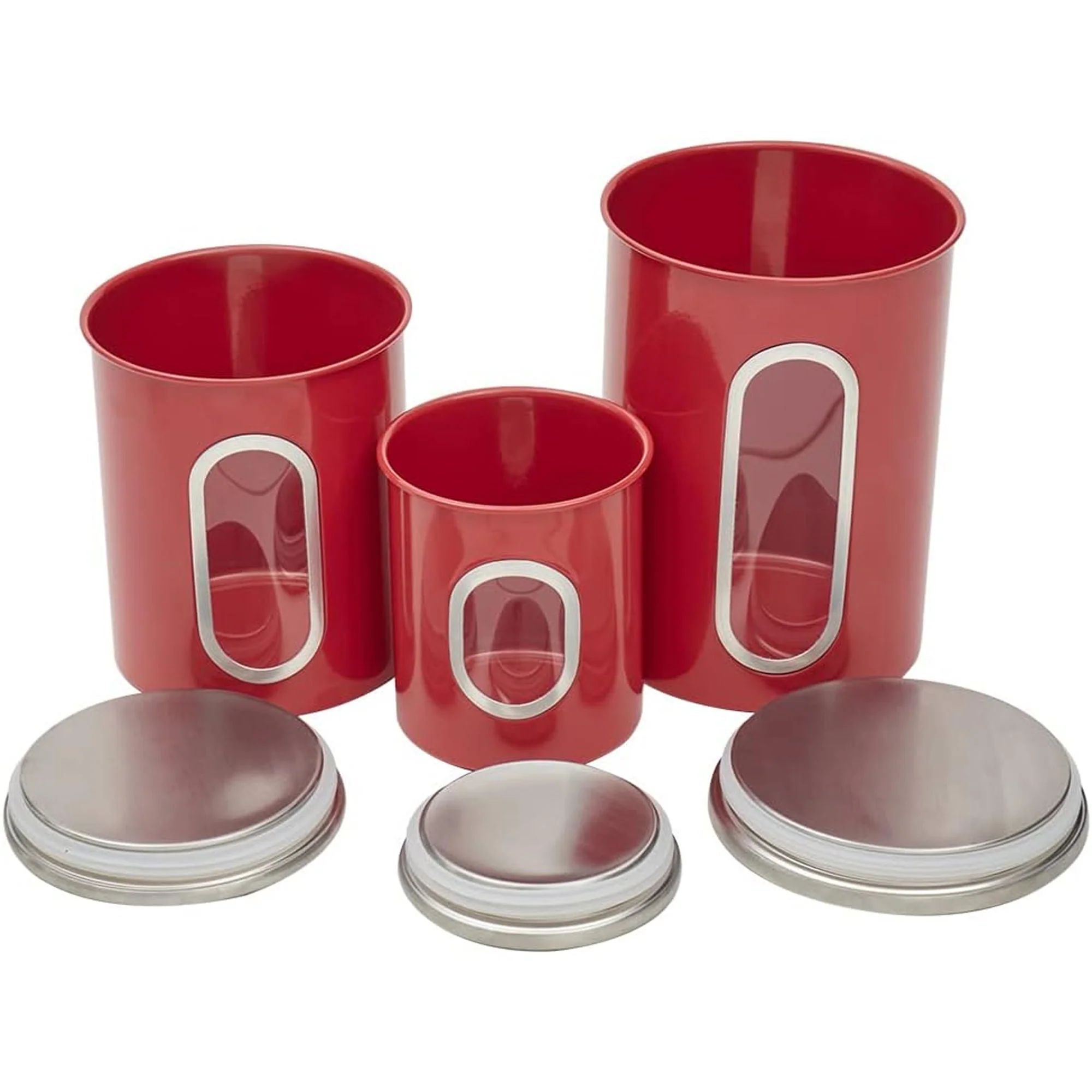 The Home Basics 3 Piece Stainless Steel Top Canisters with Windows in Red add flair and functionality to your kitchen storage. Crafted from durable stainless steel, these canisters boast a sleek design, complemented by vibrant red accents that elevate your kitchen decor.Featuring convenient windows, these canisters allow you to easily monitor your food supply, ensuring you never run out of essentials. The set includes three sizes: 29.1 ounces (4.13x4.13x4.72 inches), 63.6 ounces (5.20x5.20x6.30 inches), and 93.4 ounces (5.71x5.71x7.87 inches), providing versatile storage options for various ingredients.Durable stainless steel construction ensures long-lasting useConvenient windows for easy monitoring of food levelsSet includes three sizes for versatile storage optionsVibrant red accents add a pop of color to your kitchen decorEnhance your kitchen organization with the Home Basics 3 Piece Stainless Steel Top Canisters with Windows in Red, offering style, durability, and functionality in one essential set.