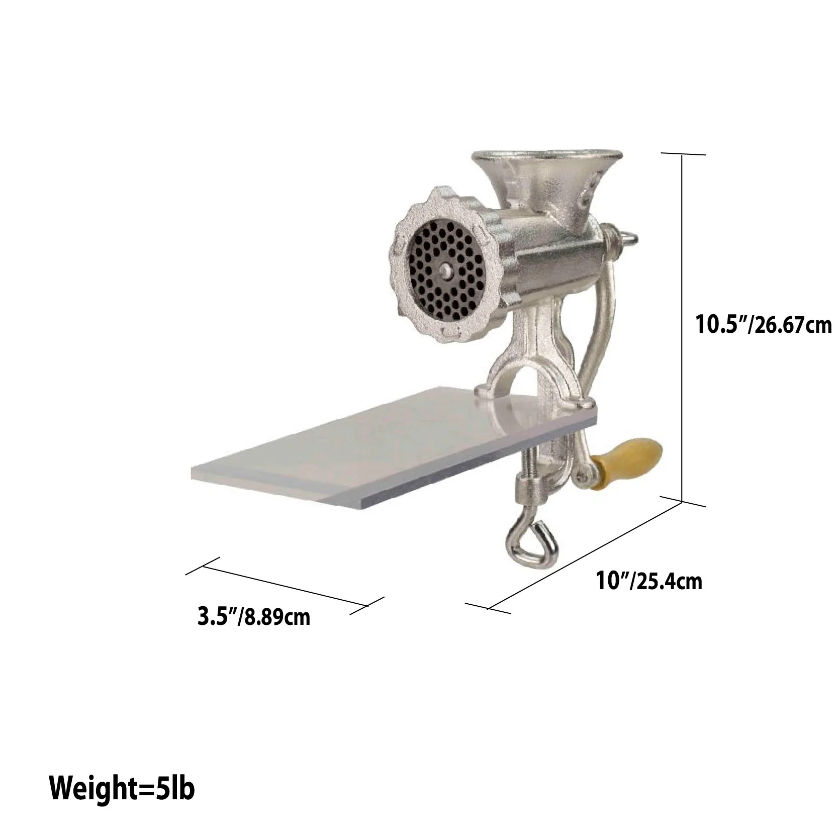 Process meat with ease using this Home Basics Cast Iron Meat Grinder. The soft wooden handle provides a smooth rotation, preventing fatigue and strain on your hands. The cast iron housing ensures long-lasting durability after frequent use. Compact in design, it fits perfectly in the corner of a countertop or cabinet. MATERIAL: Cast Iron. SIZE: 10x10.5x3.5 Inches. COLOR: Silver